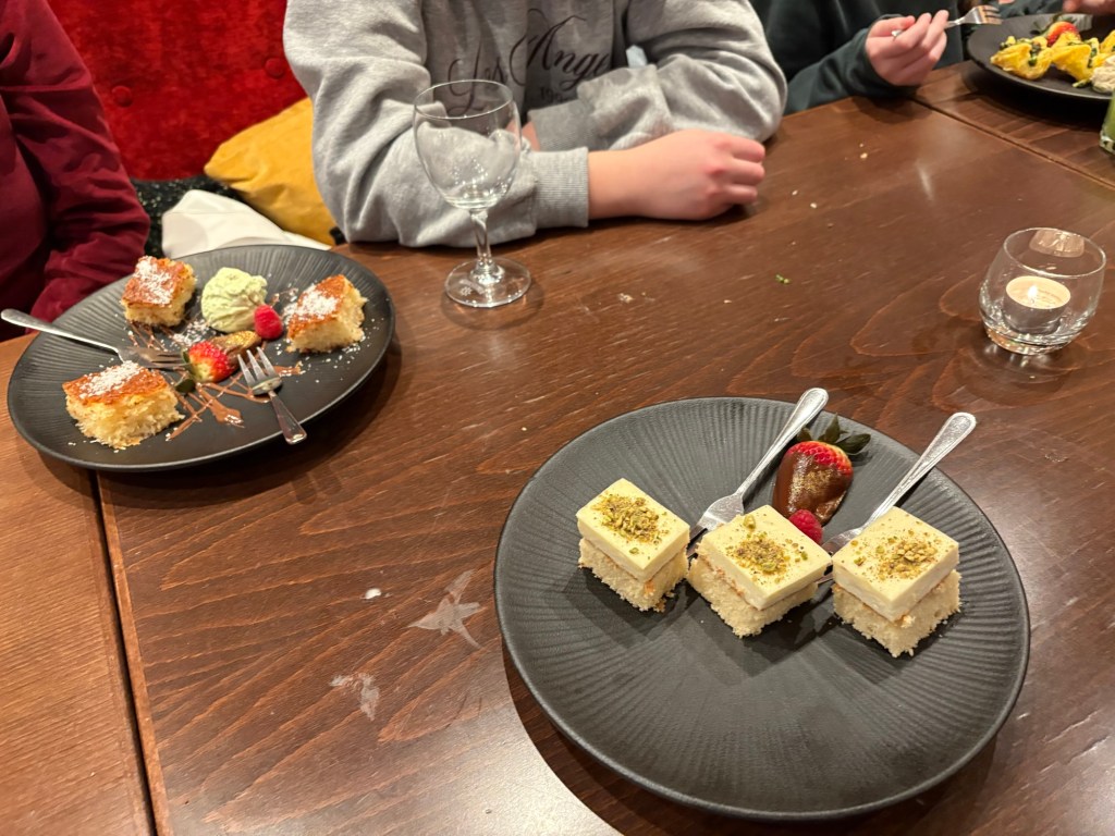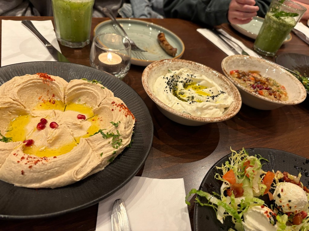 Es gibt Kuchen- und Keksreste, Geschenke werden ausgepackt, Musik gehört und dann trudeln auch der Liebste und das Teilzeitkind ein und werden ebenfalls versorgt. Kurz vor 6 laufen wir hinüber zum arabischen Stammlokal und treffen dort auf das Brüderchen, seine Freundin, den Leipziger Cousin und eines seiner Kinder (fast 10). Es gibt es großes Hallo und dann erstmal jede Menge Meze und frisch gemachte Slush-Limonada.