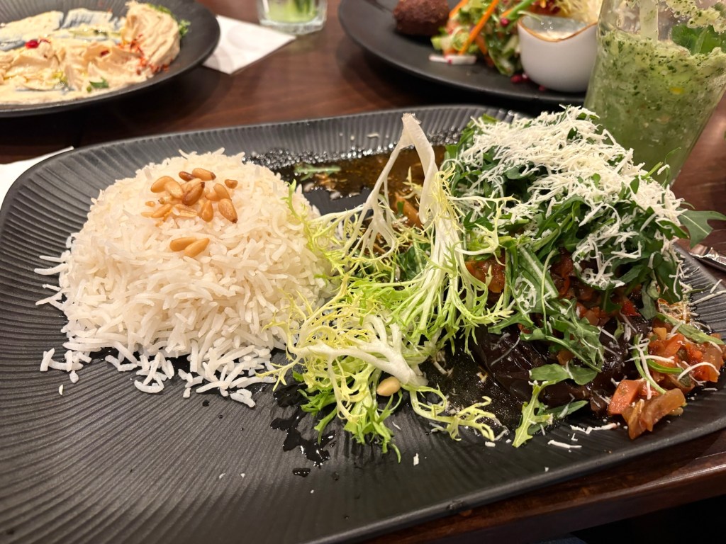 Mein Hauptgericht ist eine gebackene Aubergine mit Nüssen, Käse, Reis und anderem, sehr gut.