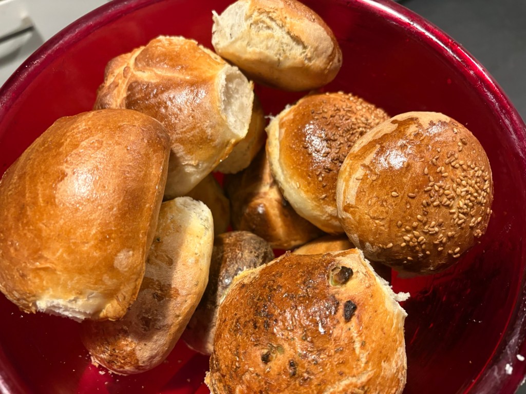 Danach lege ich mich einfach wieder hin, der Liebste zockt eine Runde, die Mitbewohnerin und ihr Freund sitzen an ihren jeweiligen Uni-Hausaufgaben und das Teilzeitkind macht Teilzeitkinddinge, in dem Fall Brötchen backen. Es gibt pure Brötchen, Brötchen mit Sesam, Brötchen mit Oliven, Brötchen mit Zwiebeln und Brötchen mit Gewürzmischung.