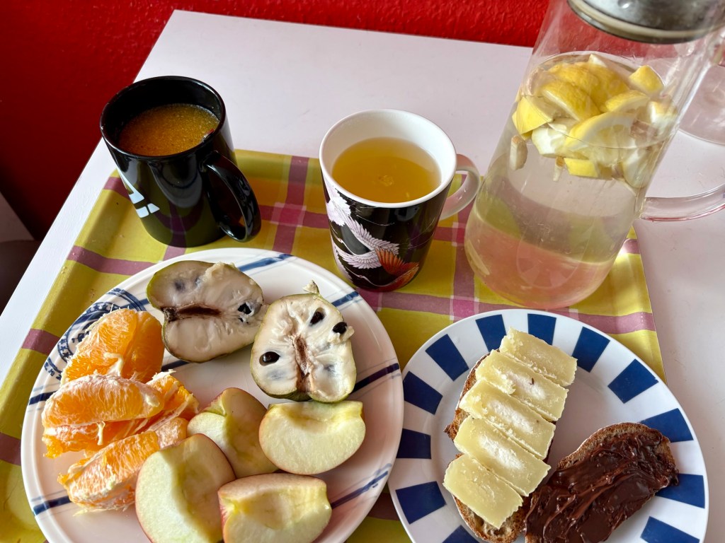 Heißer Sanddorn mit Flohsamenschalen, Ingwer-Zitrone-Tee mit Honig, Apfelsine, Apfel, Zimtapfel, Käsebrot (vorletzter Harzer), Schokobrot