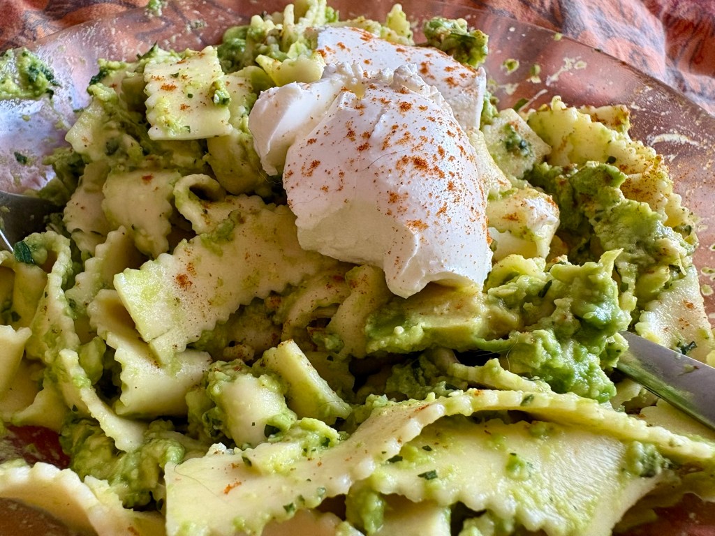 Zum Mittag gibt es Pasta mit Avocado, Limettensaft, Koriander, Ziegenfrischkäse und Cayenne-Pfeffer. Danach brauche ich einen ausgiebigen Mittagsschlaf und nach diesem reicht es mir dann auch mit Projekt und ich gebe mich dem Krankheitsgewinn hin, schlürfe Tee und gucke Sachen: