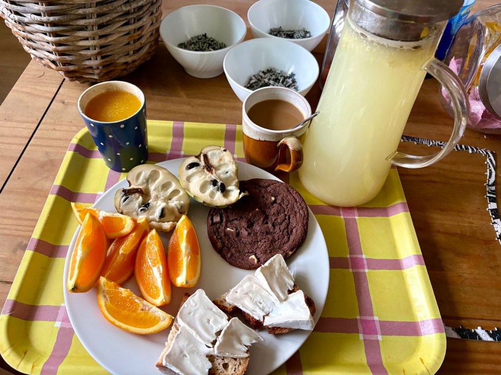 Die Erkältung muss jetzt langsam mal endgültig weg, deswegen püriere ich eine „ganze halbe“ Zitrone mit Ingwer, gieße mit heißem Wasser auf rühre Honig hinein. Der Rest heißes Wasser kommt einerseits auf Sanddornsaft, andererseits auf vietnamesisches Kaffeepulver. Ansonsten Brot mit Ziegenkäse, Crowdfarming-Orange, Crowdfarming-Zimtapfel und den letzten Chocolate Chip Cookie von gestern.
