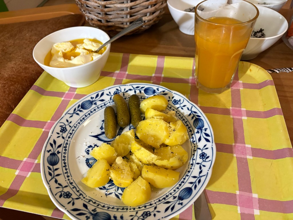 Während ich mit dem Liebsten telefoniere, mache ich mir aus den letzten Kartoffeln, dem letzten Quark und dem letzten Leinöl Abendbrot, dazu Spreewaldgurken und Sanddornschorle – ein Potpourri von Heimatfutter.
