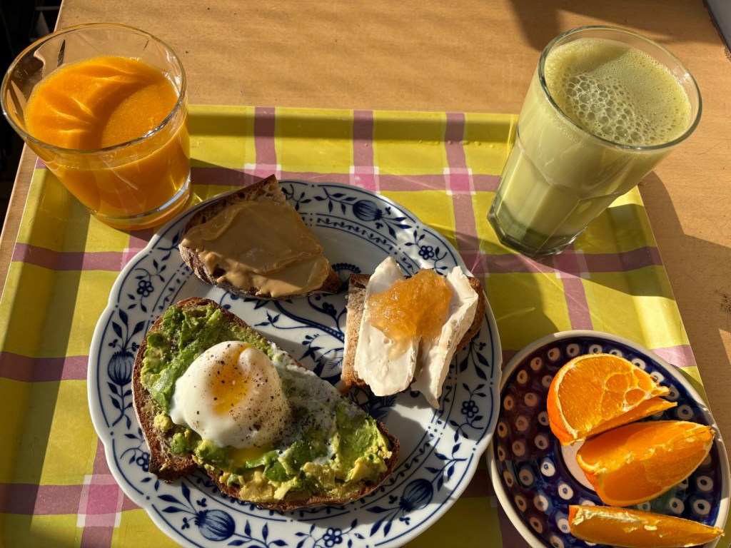 Das Frühstück hat mehrere Experimente in sich: Der Rest Sanddornsaft wurde mit Kokoswasser gemischt, was erstaunlich gut geht. Das Ei wurde in der Mikrowelle pochiert, was auch erstaunlich gut geht, aber da muss ich noch bisschen experimentieren, bis es auf den Punkt ist. Ansonsten Avocadobrot, Brot mit Ziegenkäse und Zitronenmarmelade, Brot mit Ahornsirupaufstrich, Matcha Latte, Orange. Farblich auch eine sehr ausgewogene Komposition!