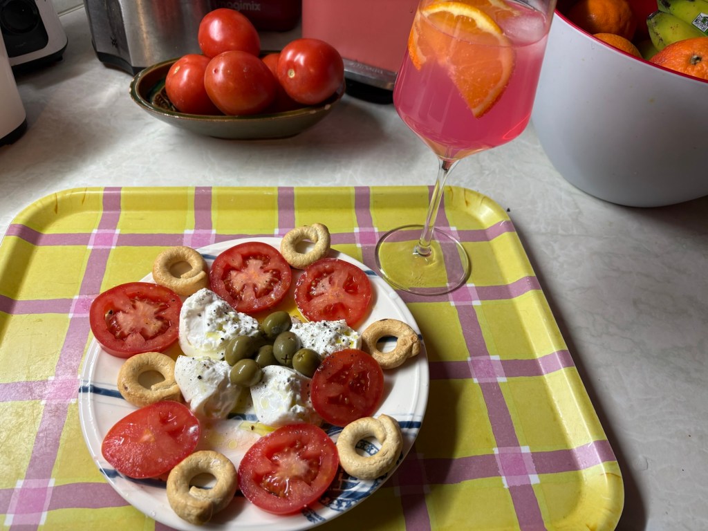 Wieder zuhause gibt es Abendbrot für die Katzen und dann für mich. Nach üppigem Frühstück und Mittag nur eine Burrata mit Tomate, Oliven und Taralli, dazu einen Sarti mit Ginger Beer.