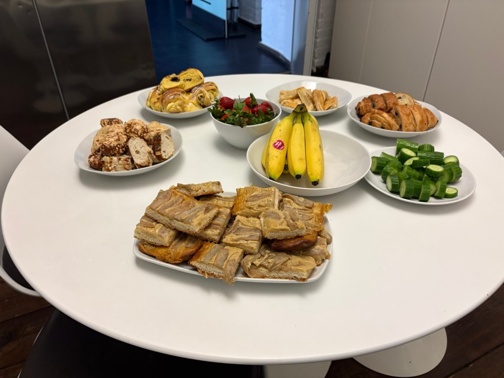 Mit insgesamt drei U-Bahnen fahre ich nach Kreuzberg (den weniger reichen Teil) ins Büro. Fühlt sich immer noch ganz neu und aufregend an. Heute ist eine weitere neue Kollegin das erste Mal da und ich kann gleich mal meine Alte-Häsinnen-Rolle üben und Fragen beantworten. Recht ambitioniert für Tag 7, aber klappt schon einigermaßen. Da heute der allgemeine Bürotag ist, gibt es um 10 dann gemeinsame Frühstücksrunde, heute sogar mit selbst gebackenem Kuchen von einer der Co-CEOs.