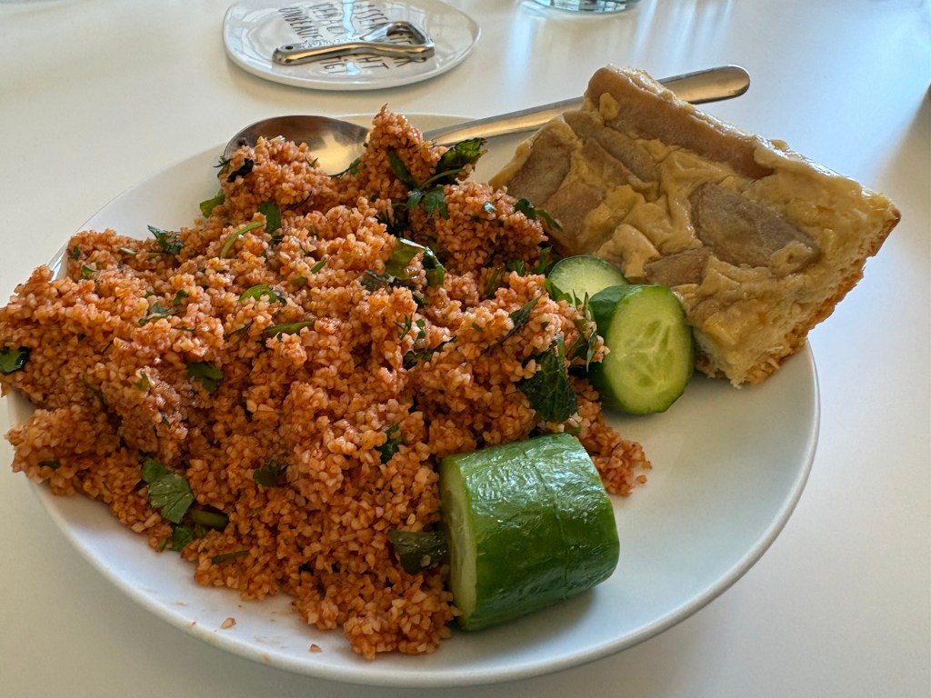 Direkt im Anschluss dann erst ein Präsenz-Meeting und dann mein erstes selbst geleitetes Remote-Meeting. Aufregend! Danach gehe ich mit drei Kolleginnen etwas zum Mittagessen holen und es gibt wieder Mittag mit Spreeblick, zum Kısır hole ich mir noch Gurken und Kuchen vom Frühstücksbuffet. Überhaupt esse ich ziemlich viel (zwischendurch) an diesem Bürotag und erinnere mich wieder, dass das ein gängiges Konzept ist.