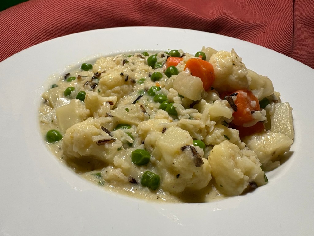 Mit zwei S-Bahnen geht es nach Hause in den Pberg, Katzen kuscheln und Abendbrot kochen. Ich muss mich langsam mal um die Karotten kümmern und Sahne muss auch weg. Es wird dann eine Variante von „Scheiß mit Reis“, zu der auch noch Kohlrabi und Blumenkohl aus der Gemüsekiste und TK-Erbsen kommen. Gewürzt mit Gemüsebrühe, Selleriesalz, Petersilie, Schnittlauch, Pfeffer und einem Spritzer Zitrone. Schmeckt bisschen nach Kantinenessen und danach, weswegen der pakistanische Ex-Mitbewohner sagt, die Deutschen würden ihr Essen nicht würzen. Aber das darf auch mal so sein und immerhin schmeckt das Gemüse nach Gemüse und der Reis nach Reis.