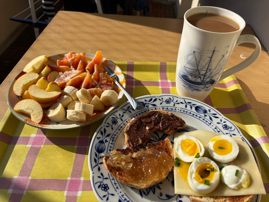 Muss dem Körper noch wieder beibringen, dass er am Wochenende länger schlafen soll als während der Woche. Und den Katzen, ich glaube diesmal ist es mal wieder Noosa, die kurz vor 6 Aufmerksamkeit haben will und dann bin ich halt wach. Anyway, dann eben früher und noch längerer morgendlicher Reboot, ich schiebe aus Gründen nach Französisch und Italienisch noch ein bisschen Sorbisch ein. Nach dem Liebstentelefonat ist dann irgendwann Frühstückszeit, kurz vor 10 ist genügend Sonne auf dem Balkon, um mit Strickjacke und Decke draußen Platz zu nehmen.