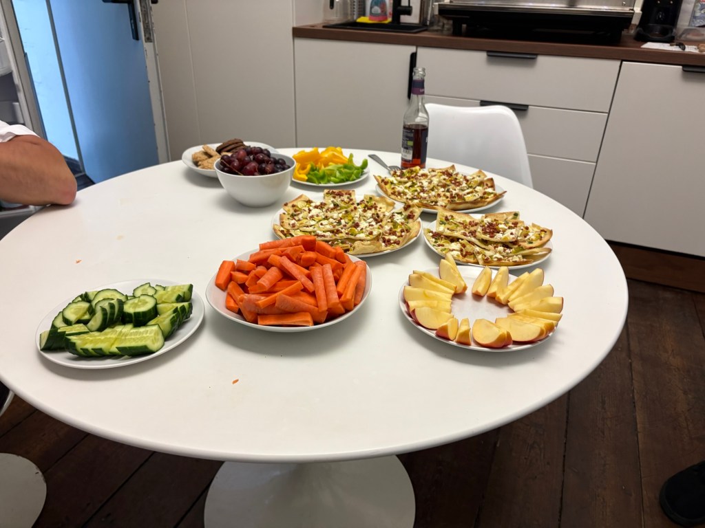 Der Vormittag plätschert mit Gesprächen und Erledigungen vor sich hin. In der Mittagspause gibt es dann Flammkuchen, Kuchen und Sekt samt Knabbereien, denn zwei Kolleginnen begehen heute ihren letzten (Büro-)Tag vor dem Mutterschutz. Dazu sind für einen Donnerstag erstaunlich viele Menschen ins Büro gekommen, so dass ich nochmal einige neue zum ersten Mal IRL treffe, unter anderem den Sorbischsprecher.