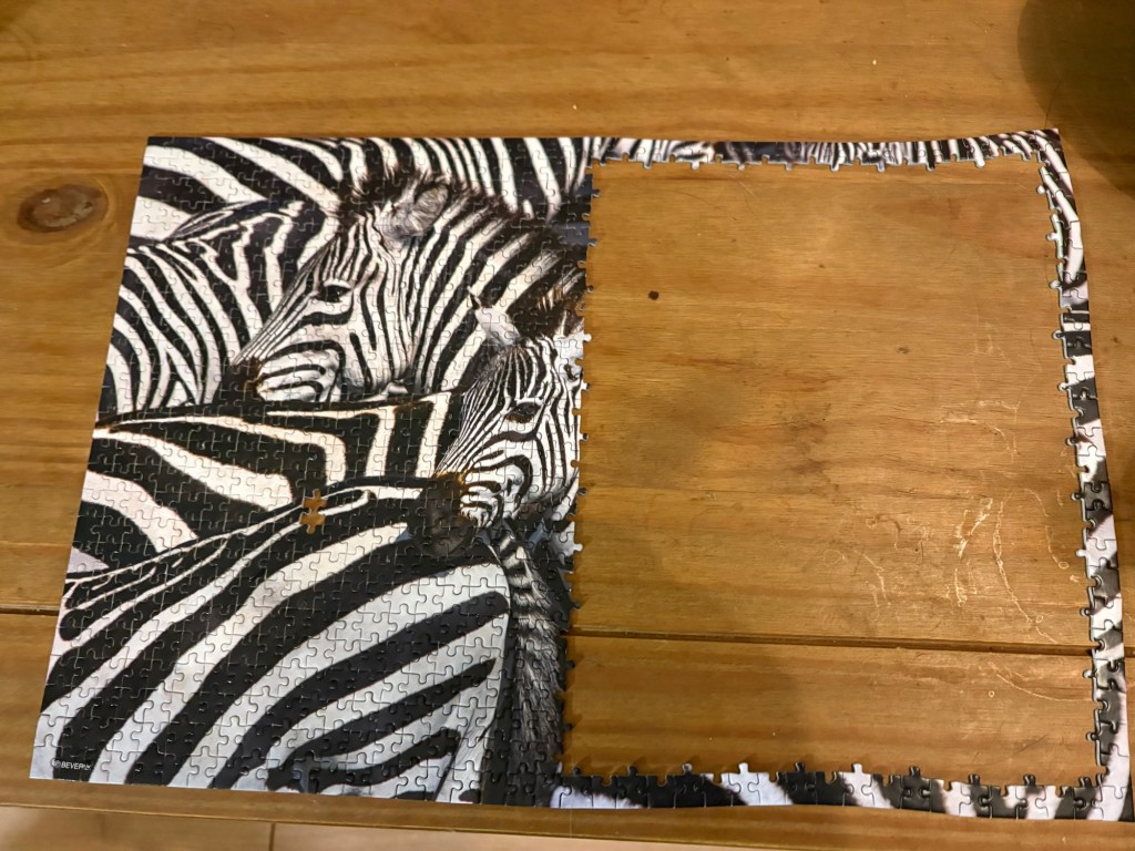 Ich schnappe mir ein alkoholfreies Weizen vom Balkon und gucke mir eine Webinar-Aufzeichnung an. Dann gibt es mehr Colcannon von gestern, mehr Hörbuch und mehr Puzzelei. Es geht voran.