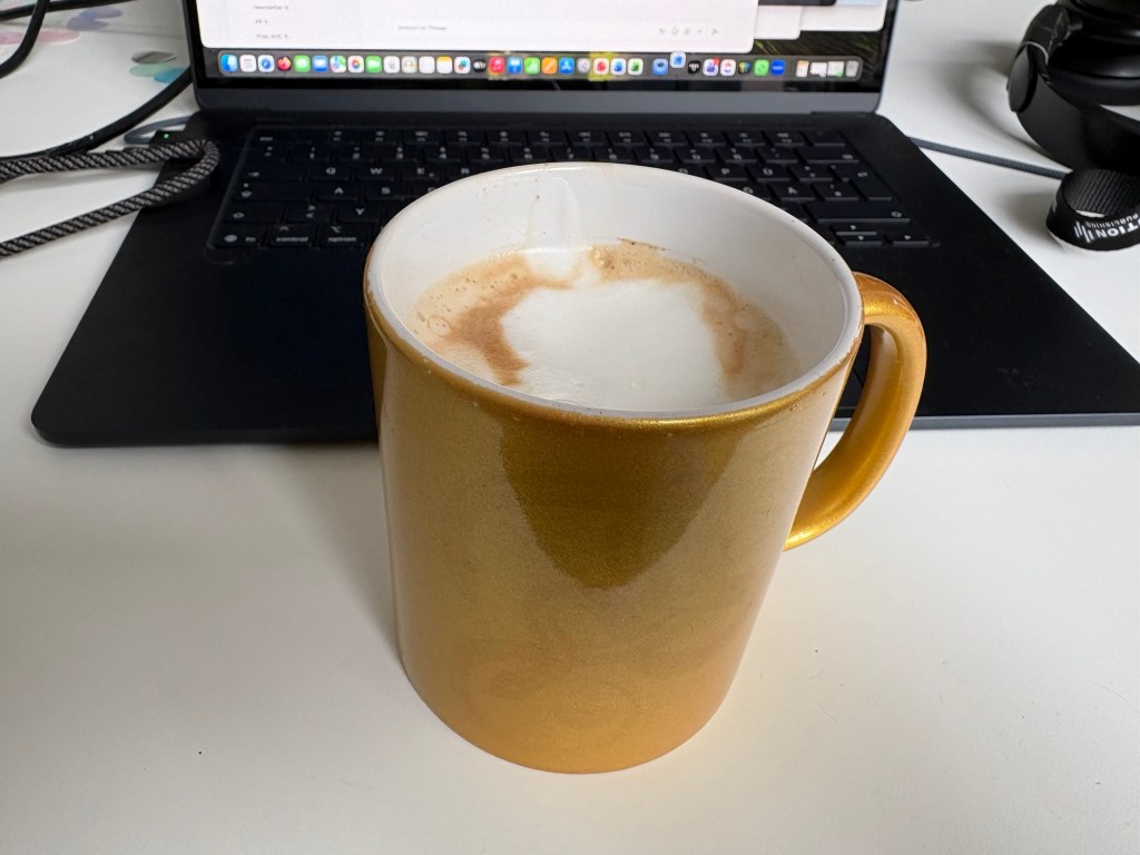 Im Büro dann erstmal schnell lauter Sachen ausdrucken, die auszudrucken sind, dann kann ich durchatmen. Ich mache mir einen schicken Siebträgermaschinenkaffee mit aufgeschäumter Milch, knabbere meinen Apfel und vertiefe mich in Mails und Aufgaben.