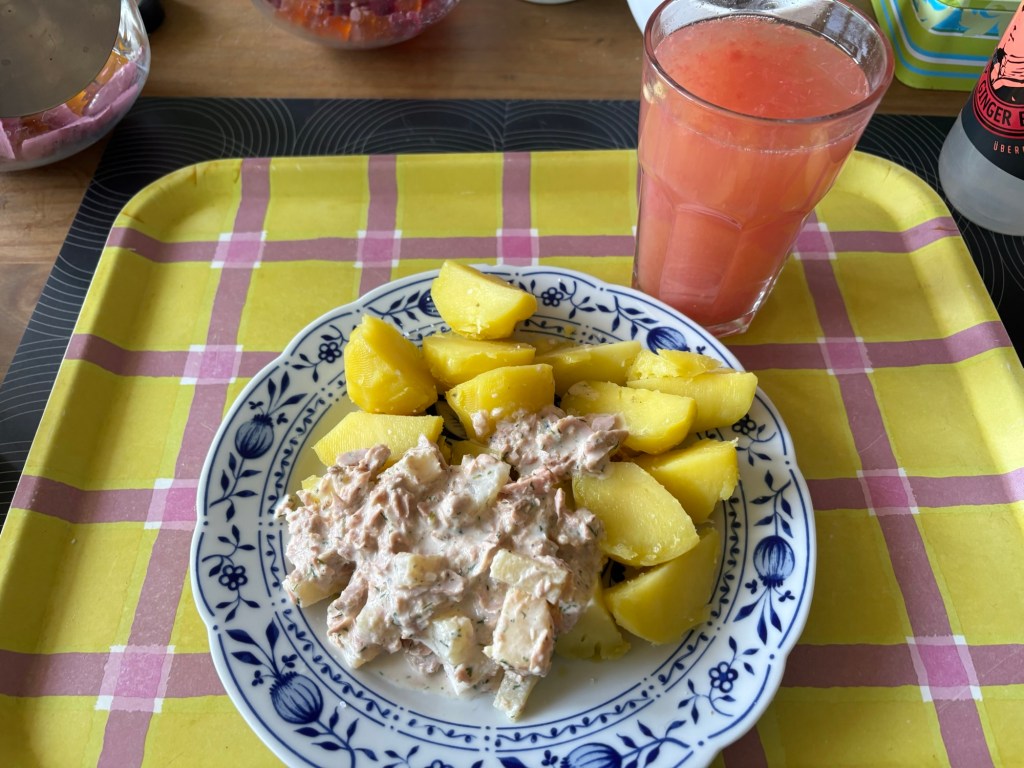 Mittags bastle ich mir etwas, worauf ich mich schon länger freue und wofür ich extra vor einer Weile bereits eingekauft habe: Einen Thunfischsalat, wie es ihn in meiner Kindheit zu besonderen Anlässen gab, leicht abgewandelt allerdings. Ich mische eine Dose Thunfisch (bei mir aus zertifiziertem Fang und in eigenem Saft) und drei klein geschnittene Ananasringe mit Joghurt (statt früher saurer Sahne) und würze mit Salz, Pfeffer, Dill und Paprikapulver. Schmeckt ziemlich exakt so, wie ich es in Erinnerung habe und wie ich es die letzten mindestens 25 Jahre eher nie gegessen habe. Ich verspeise die Hälfte davon mit ein paar schnellen Pellkartoffeln und trinke dazu den Ananas“saft“ vermischt mit einer ausgepressten Grapefruit und etwas Kokoswasser (früher eher mit noch mehr Zucker und Mineralwasser vermischt).