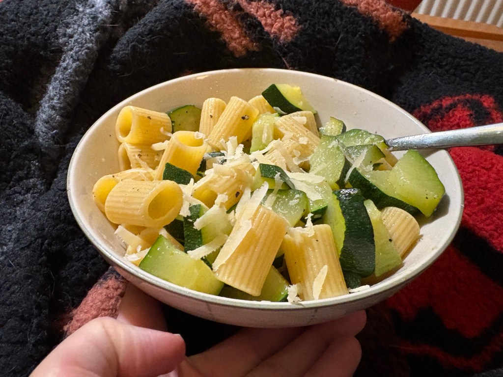 Es gekochte Zucchini mit in Zucchiniwasser gekochter Pasta, Olivenöl, Zitronensaft und Grana Padano, dazu ein Glas Cattaratto, das mich noch durch den weiteren Abend begleitet, während dem ich nochmal zwei Stunden in mein Projekt stecke.