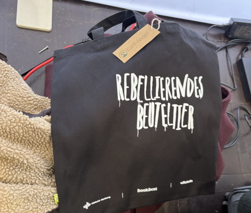 Die Masse walzt sich dann auf die Messehallen zu, zum Glück kann ich dann aber zum Ausstellendeneingang abbiegen und komme zügig rein, dann noch unseren Stand finden, die Kolleginnen begrüßen und dann kann ich endlich ablegen, kurz durchatmen und dann verspätet meinen „Dienst“ antreten (auf der Fahrt und beim Stehen in Halle habe ich schon ein paar Dinge auf dem Handy erledigt). Jetzt aber Hands on Sachen machen! Wir unterhalten uns mit Besucher*innen, verteilen Goodies, erklären, was wir machen und bereiten gleichzeitig alles für eine Signierstunde vor, die gleich bei uns am Stand stattfindet. Zwischendurch kommen immer wieder Kolleginnen vorbei, die Termine auf der Messse haben – Gespräche mit Kontakten und aktuellen wie potenziellen Kund*innen oder Moderationen auf der Bühne – und hier ihre Basis haben. Zukünftig werde ich bei solchen Gelegenheiten auch Termine haben, aber da ich erst so frisch dabei bin, habe ich heute noch den „leichteren“ Job, unterstütze am Stand und mache nebenbei Fotos für Social Media.