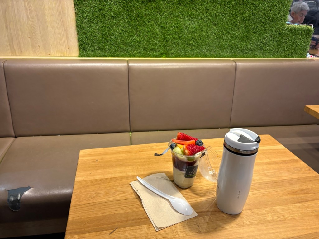 Der Wecker klingelt um 6, da hänge ich schon seit einer halben Stunde im morgendlichen Reboot. Gegen 7 stehe ich auf, mache mir einen Kaffee zum Mitnehmen und gehe dann kurz vor der Mitbewohnerin aus dem Haus. Auf dem Weg zur Straßenbahn stelle ich fest, dass mein Zug eine knappe Stunde Verspätung haben wird und stelle mich also auf längeres Warten am Bahnhof ein. Dort angekommen hole ich mir einen Grießbrei mit Obst zum Kaffee.
