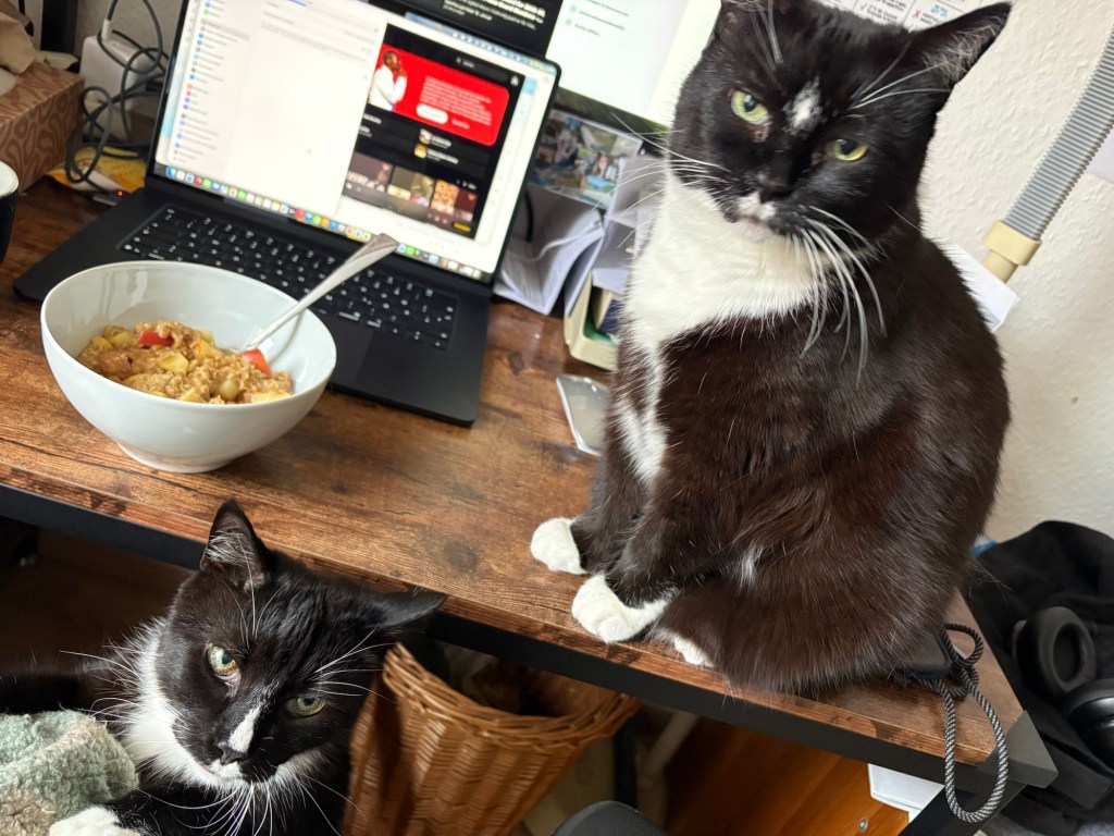 Ich will irgendwann mal wieder so lange schlafen, dass beim Aufwachen weder eine 5 noch eine 6 als erstes auf der Uhr steht. Das ist doch jetzt hoffentlich keine permanente Alterserscheinung? Anyway, genügend Zeit für ausführlichen morgendlichen Reboot im Bett, Frühstückszubereitung und ein Update am Dienstlaptop, bevor der Arbeitstag losgeht. Die Katzen treten auch zum Morgenappell an.