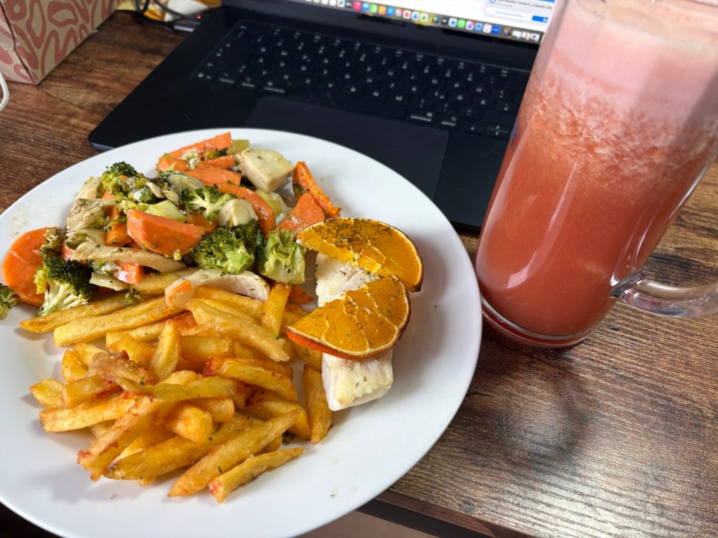 Mit Porridge (gekocht im Rest Golden Milk von gestern Abend und mit Apfel) und Ostfriesentee geht es durch den Arbeitsmorgen. Am späten Vormittag ein Meeting, danach zwei Webinare. Beim zweiten esse ich nebenbei Fisch-Gemüse-Reste von gestern mit Pommes-Resten von vorgestern und trinke einen Grapefruit-Kokoswasser-Smoothie mit Granatapfelsirup.