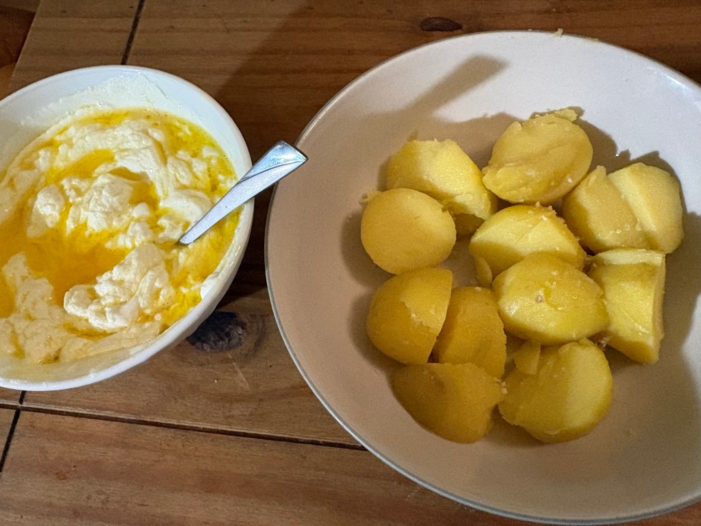 Wieder zuhause koche ich mir Pellkartoffeln mit Quark und Leinöl, oder auf Sorbisch samobělene běrny z twarohom a lanym wolijom (mit Sotra übersetzt) wobei man nochmal ausdifferenzieren müsste, ob man in meiner Gegend wirklich běrny oder eher neple oder gar kulki sagt. (OK, das Sorbische Institut bestätigt běrny.)
