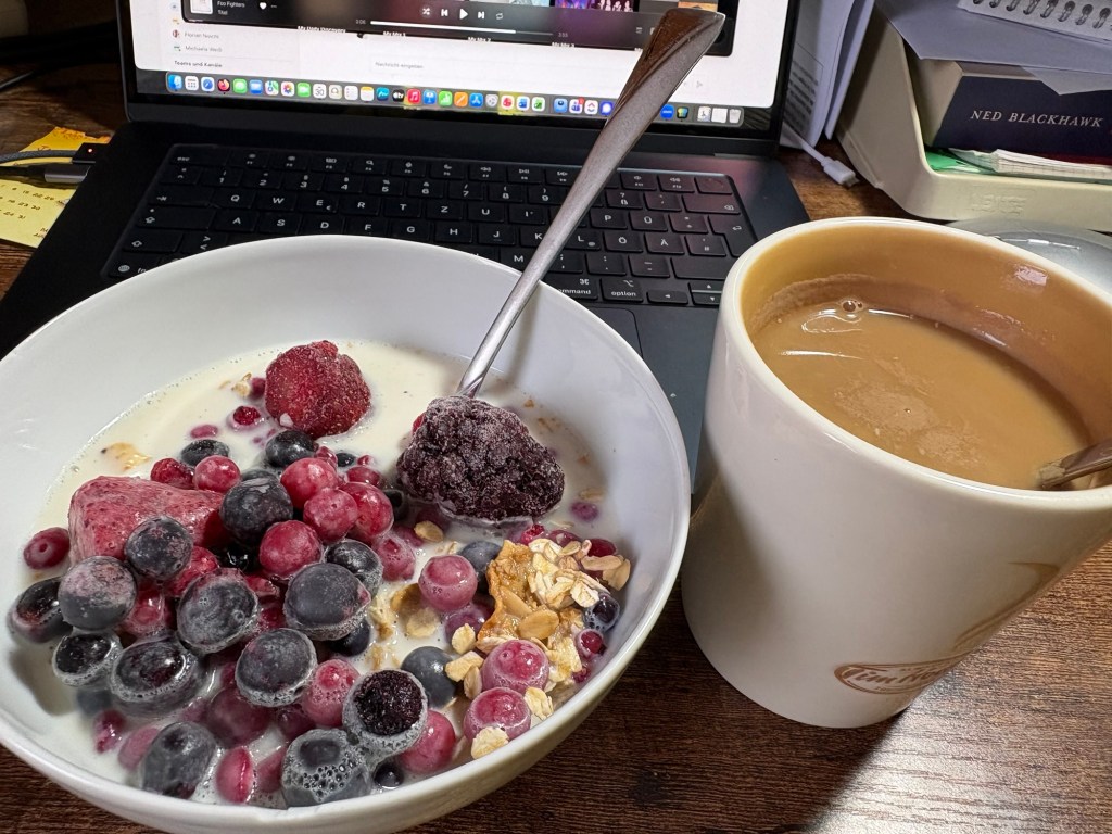Ganz erstaunlich, ich habe den Wecker extra auf später gestellt, wegen Homeoffice, werde wie üblich früher wach als nötig und fühle mich trotzdem ziemlich ausgeschlafen. Möglicherweise hilfreich, dass die Balkontür inzwischen wieder verdunkelt ist, vielleicht hätte ich das schon ein, zwei Wochen früher machen sollen. Trotzdem schwer, heute in Gang zu kommen, aber pünktlich zum Arbeitsbeginn sitze ich am Schreibtisch.