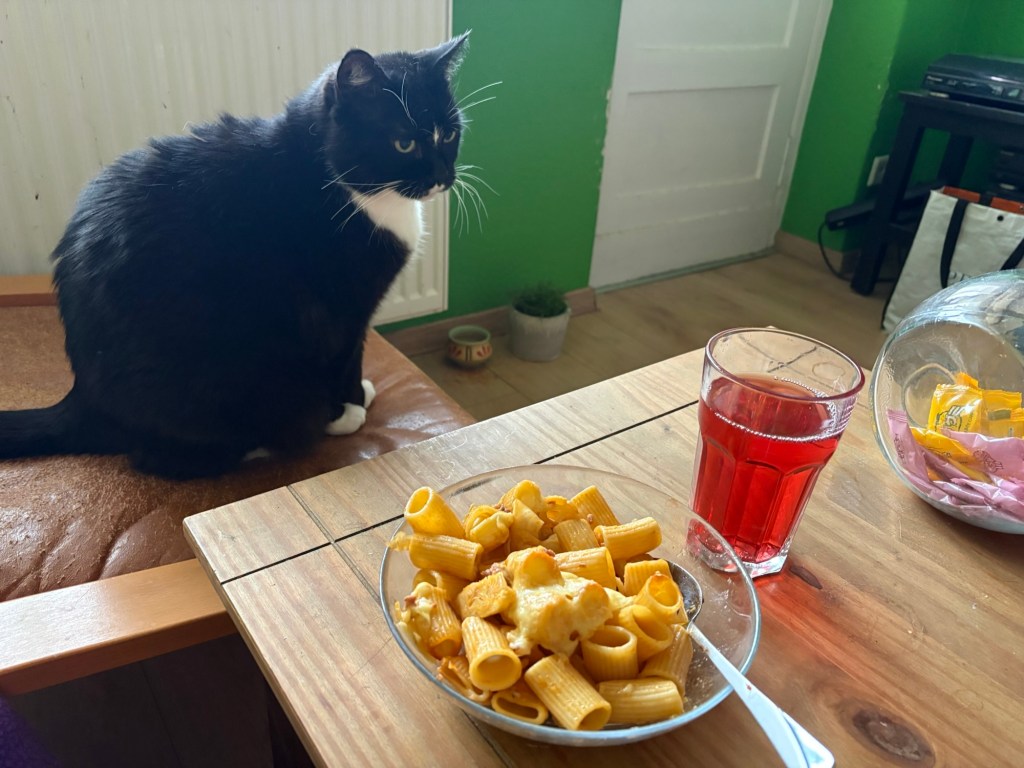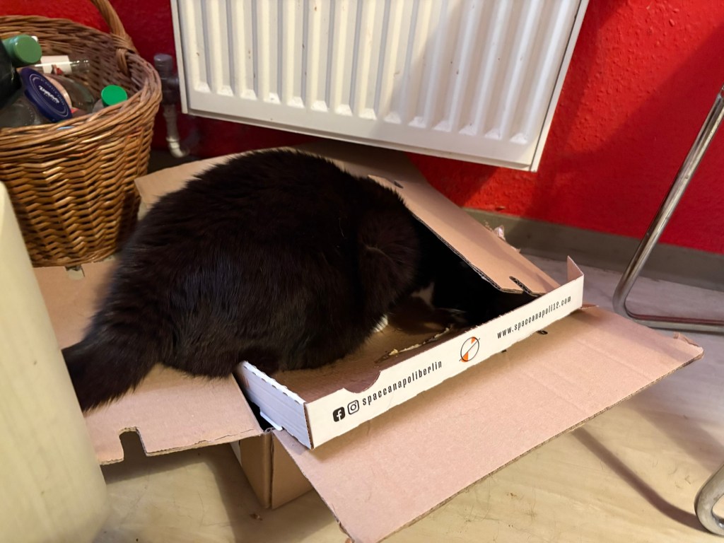 Während ich Stullen schmiere, kriecht Nimbin plötzlich in den Pizzakarton, der schon seit zwei Tagen beim Altpapier liegt und kümmert sich um die Mozzarellaflecken, der kleine Gierschlund.