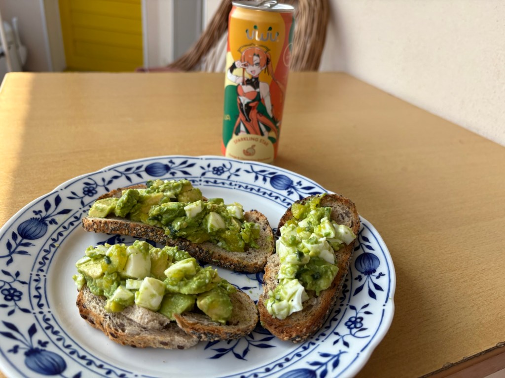 Zum Mittag gibt es Brot mit letztem Ei und letzter Avocado – schön GRÜNdonnerstäglich. Dazu Orangen-Clementinen-Limonade mit Projektbezug, dazu setze ich mich noch kurz auf den Balkon, bis die Sonne rum ist.
