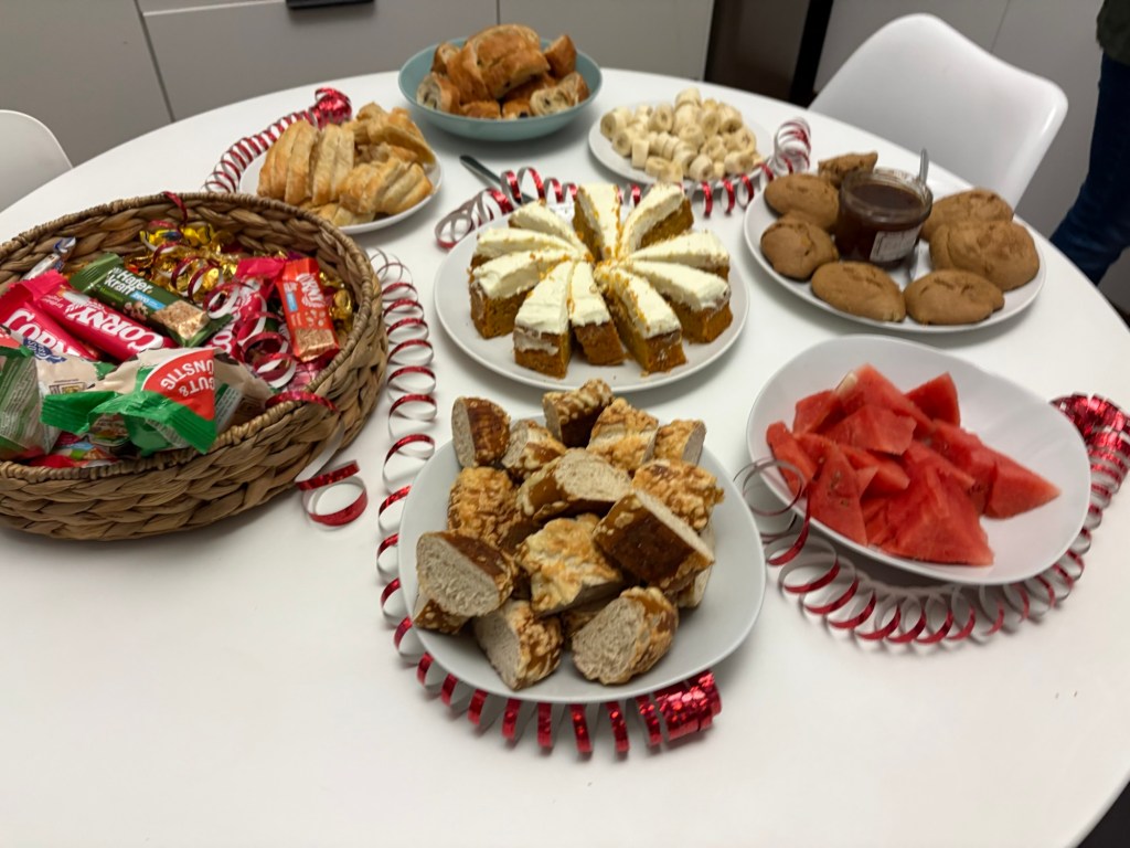 Nach der ersten Stunde und ordentlich Mate für mich gibt es die wöchentliche Frühstücksrunde, diesmal erweitert um Geburtstagskuchen und -scones von einer Kollegin.