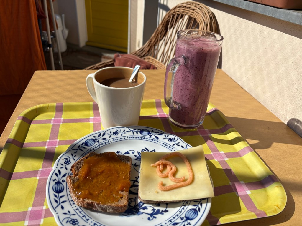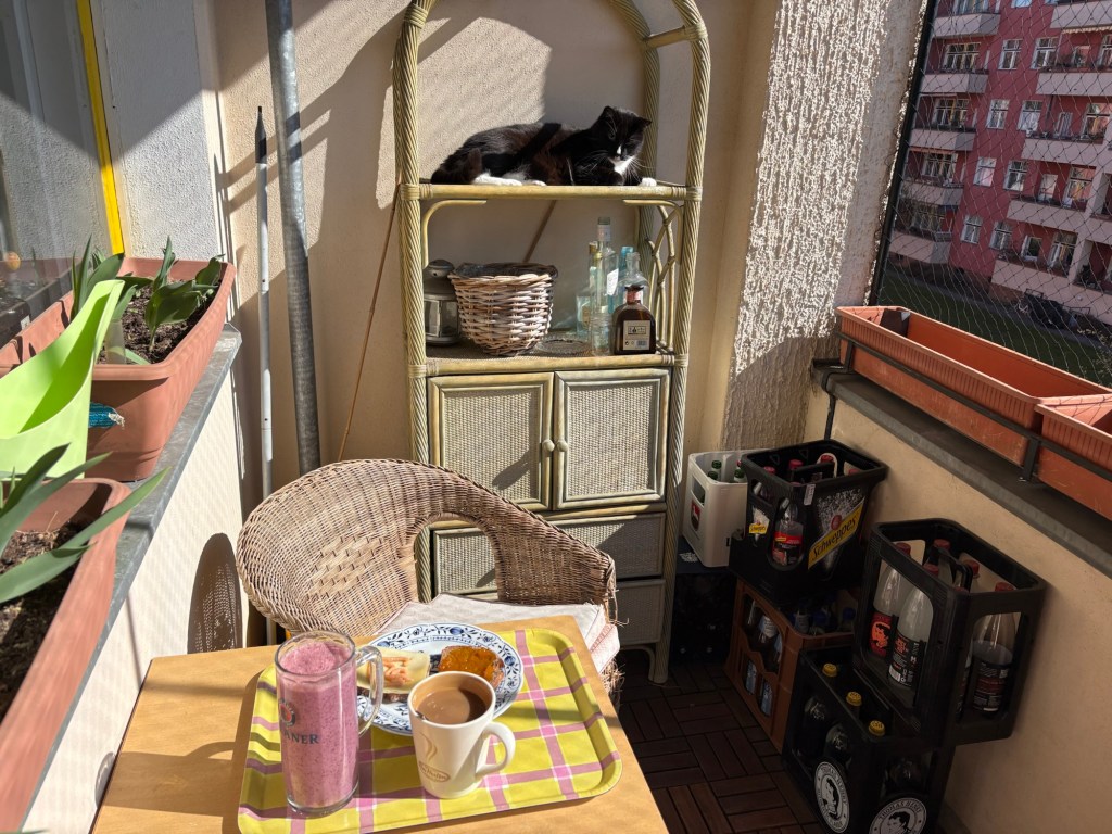 Die Nacht ist relativ kurz, weil die Katzen nach schon wieder mehreren Nächten ohne mich viel Aufmerksamkeit benötigen. Irgendwann zwischen 7 und 8 gebe ich auf und beginne den morgendlichen Reboot. Aufstehen und Frühstück machen ist dann erst gegen halb 11, evtl. habe ich dazwischen das erste Mal heute prokrastiniert. Dafür aber ist es inzwischen sonnig draußen, also Balkonfrühstück!