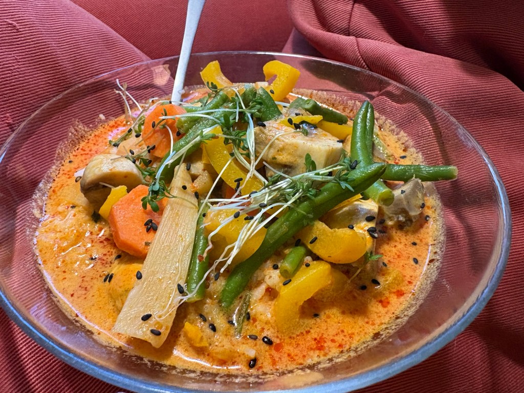 Dafür koche ich mir ein sehr leckeres rotes Thai-Curry mit Zwiebel, Knoblauch, Ingwer, Kurkuma, letzten Karotten, gelber Paprika, braunen Champignons, TK-Bohnen und eingelegten Bambussprossen, dazu Limettensaft, Basmati, schwarzen Sesam und Kresse. Tofu hatte ich auch noch gekauft, den lasse ich aber am Ende weg, weil es sonst insgesamt zu viel wird.