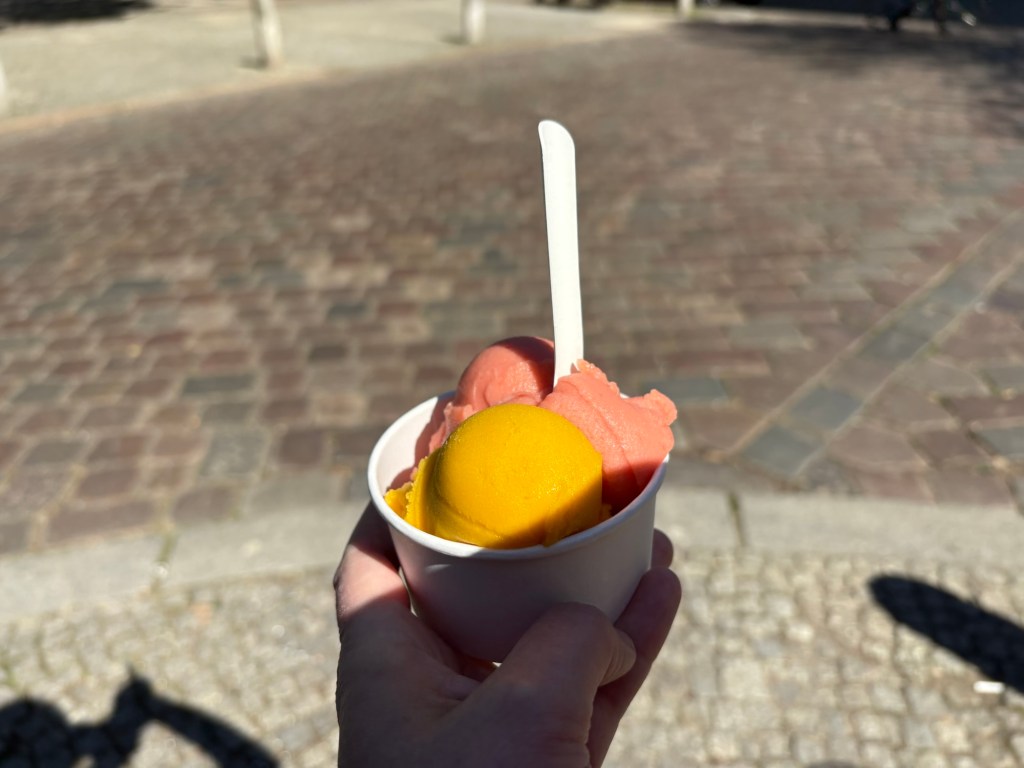 Nach dem Webinar dann die richtige Mittagspause. Ich spaziere bei schönstem Sonnenschein durch den Kiez, mache eine Besorgung und hole mir auf dem Rückweg ein Eis.