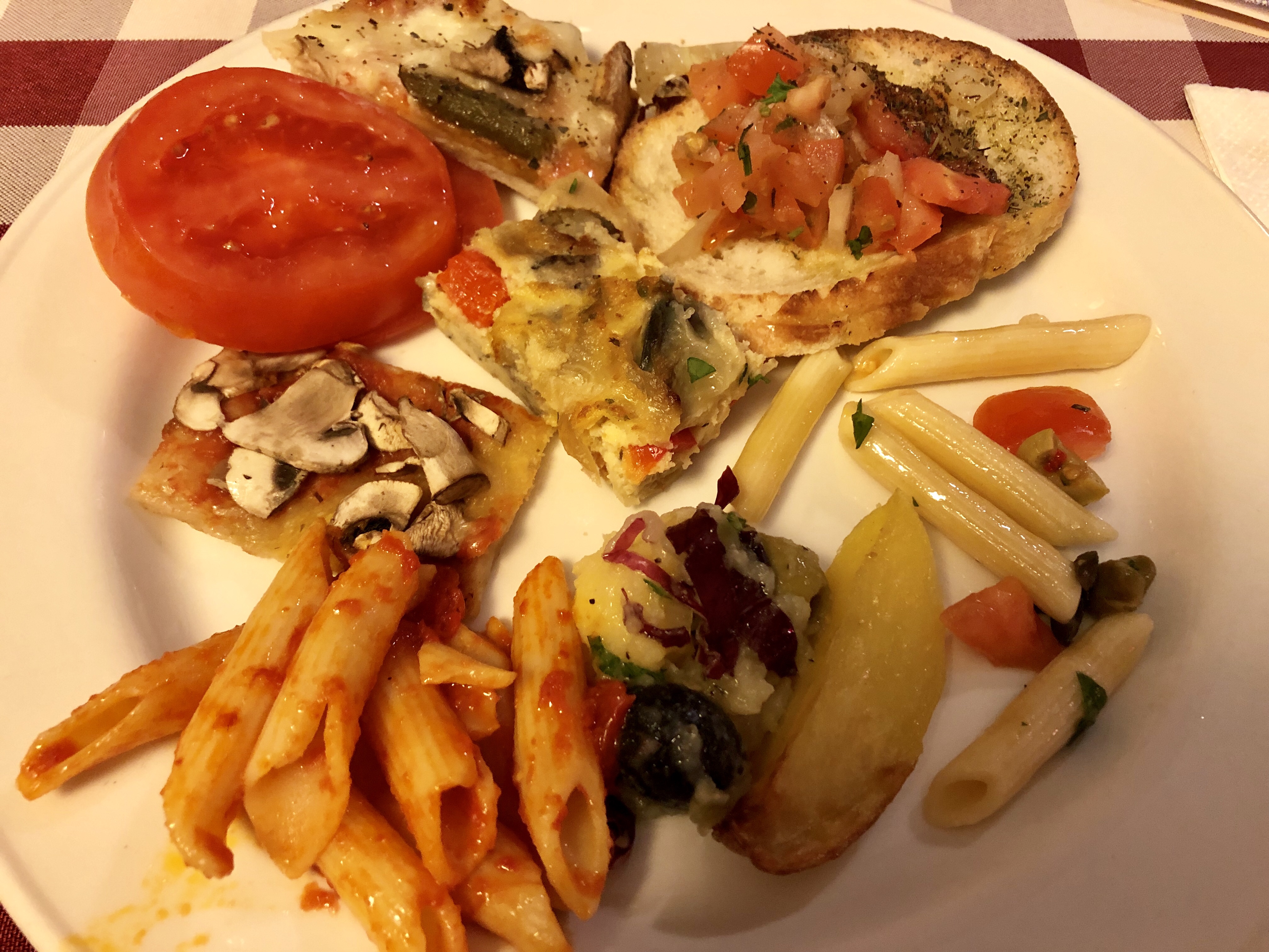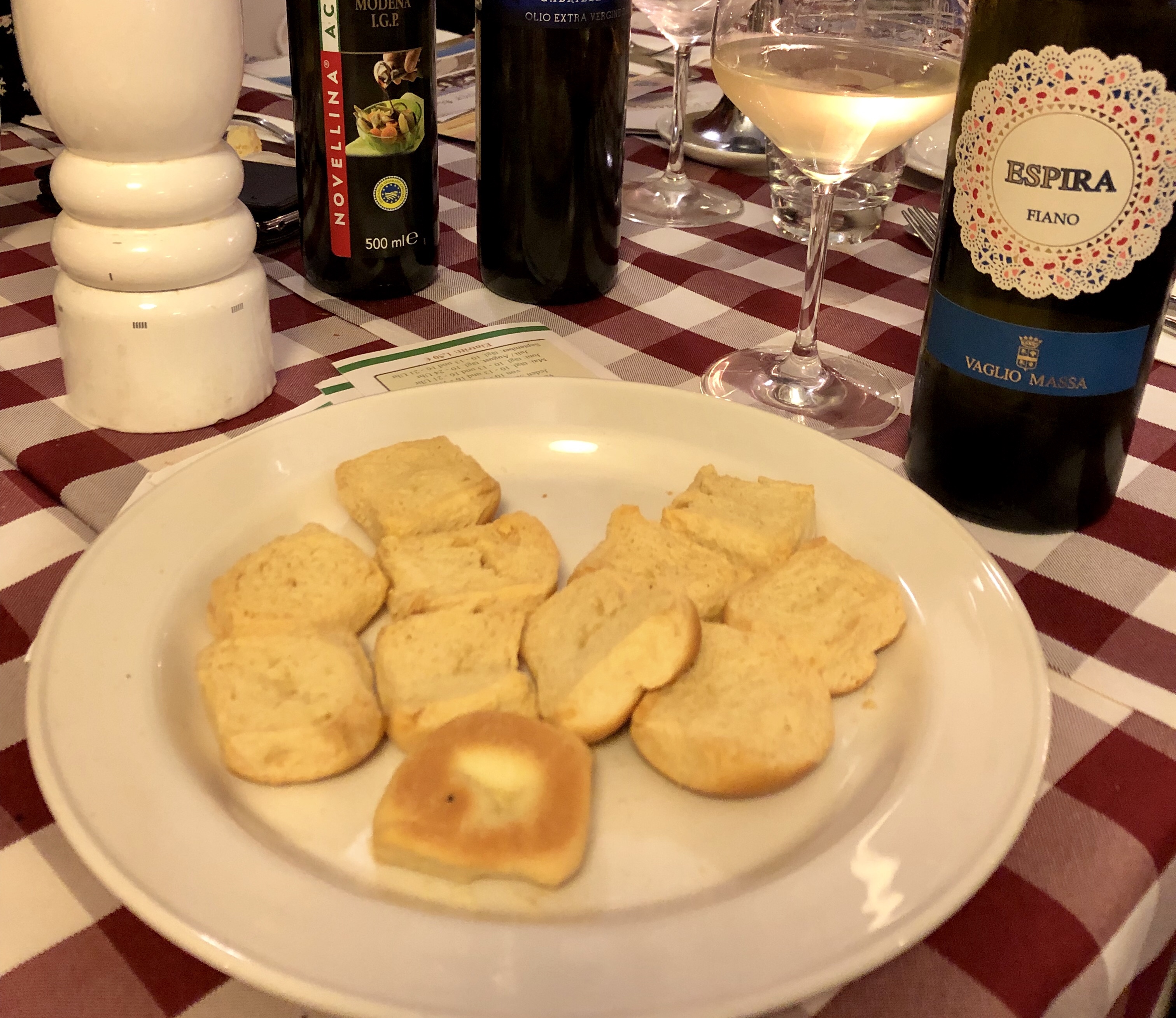 Als Gruß aus der Küche bekamen wir hauchdünn geschnittene Mortadella aus Bologna serviert, mit gutem italienischen Weißbrot und einem sehr leckeren, grasigen Olivenöl mit nur einer ganz leichten Schärfe im Abgang (auch das etwas, womit der Hase nicht so gut umgehen kann, während ich in dem Öl hätte baden können).