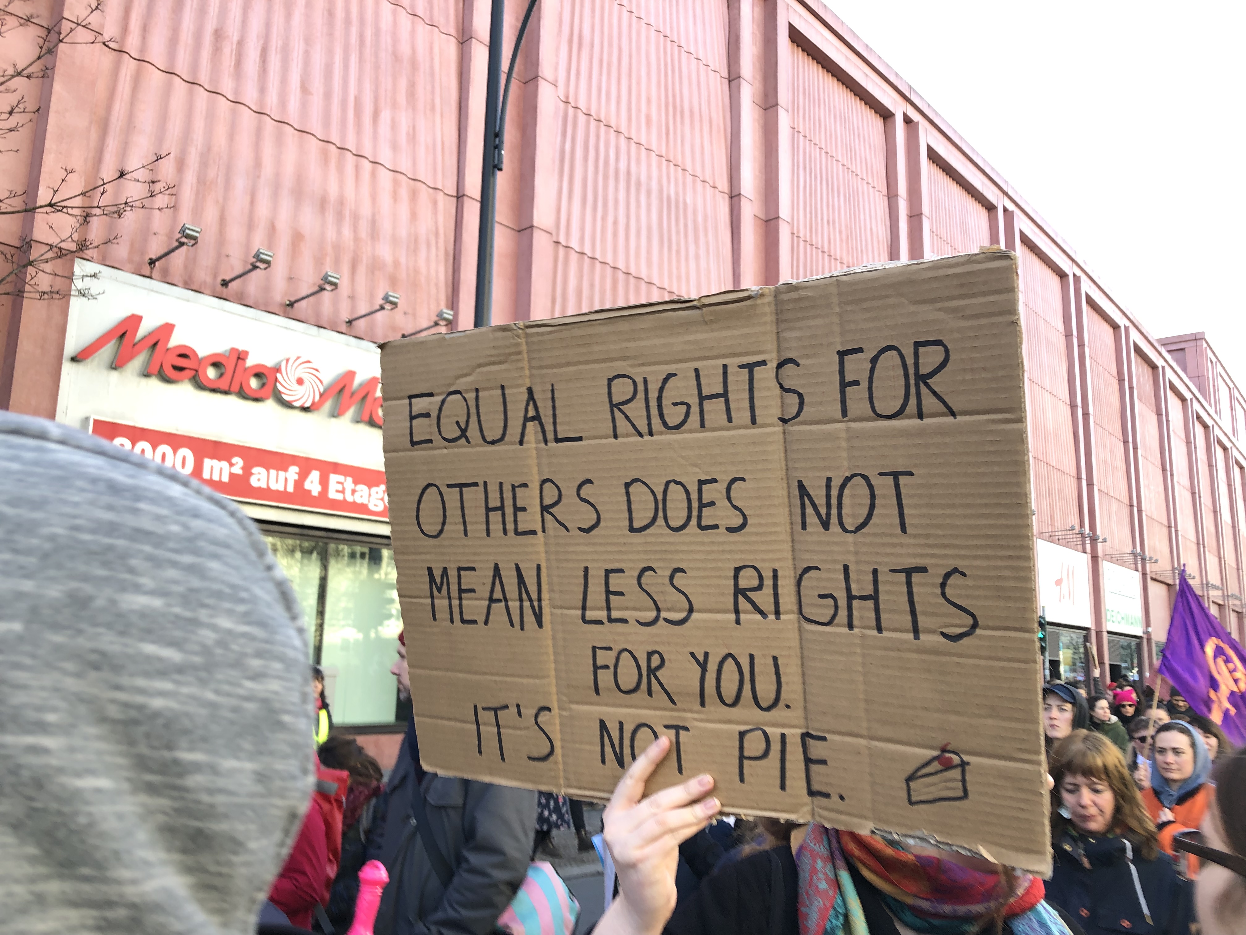 Die nächsten Stunden verbrachte ich gemeinsam mit meinen beiden Berliner Cousinen, dem Lieblingsnachbar und jeweils noch Freundinnen der drei auf der großen Demo zum Frauenkampftag. Vermutlich lag es daran, dass Feiertag war (und dass der Regen auch pünktlich zur Startzeit aufhörte), aber diese Demo war richtig groß und voll – zwischendurch sprachen die Veranstalter*innen von über 20.000 Teilnehmer*innen. Was mir außerdem aufgefallen ist: Es waren für mich überraschend viele Männer am Start. Natürlich verschätzt man sich da auch schnell, aber ich würde sagen das waren schon mindestens 30% und eher ein paar mehr – gerade bei den jüngeren Teilnehmer*innen.