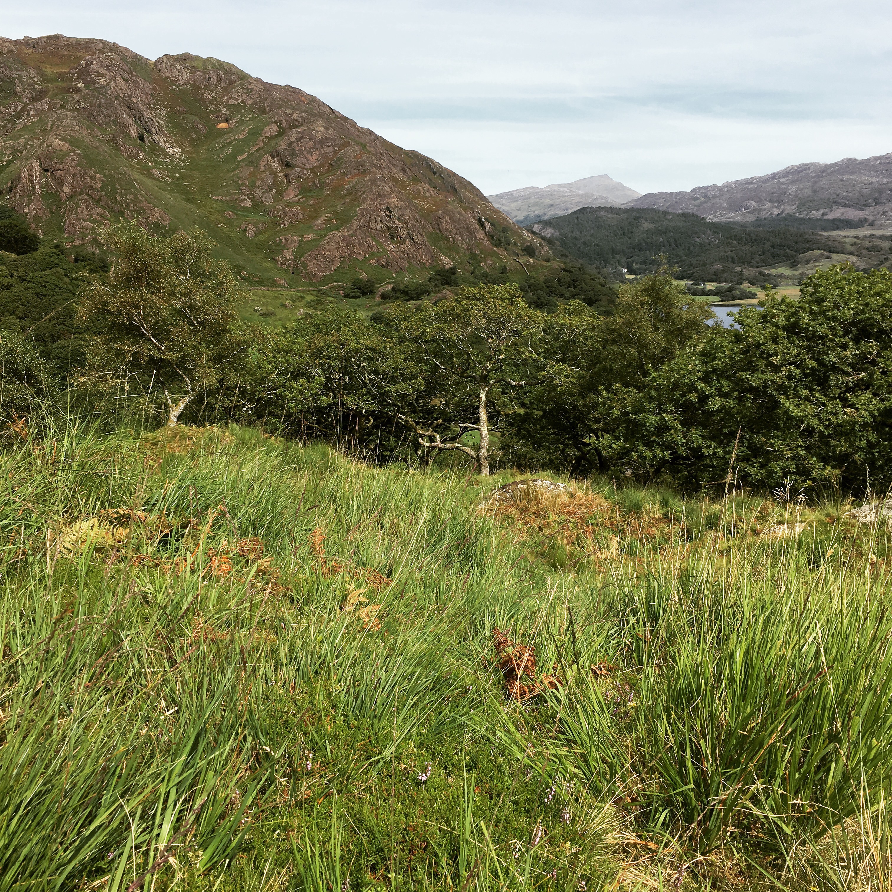 Ein wenig später geht es durch einen lichten Laubwald und dann hinauf auf den Gipfel des Dinas Enrys, unter dem damals der rote keltische Drache und der weiße sächsische Drache so lange miteinander gekämpft haben und dabei so viel Unruhe und Lärm verursachten, dass Merlin sie freiließ. Seitdem kämpfen Kelten und Angelsachen überirdisch über die Vorherrschaft auf den britischen Inseln.