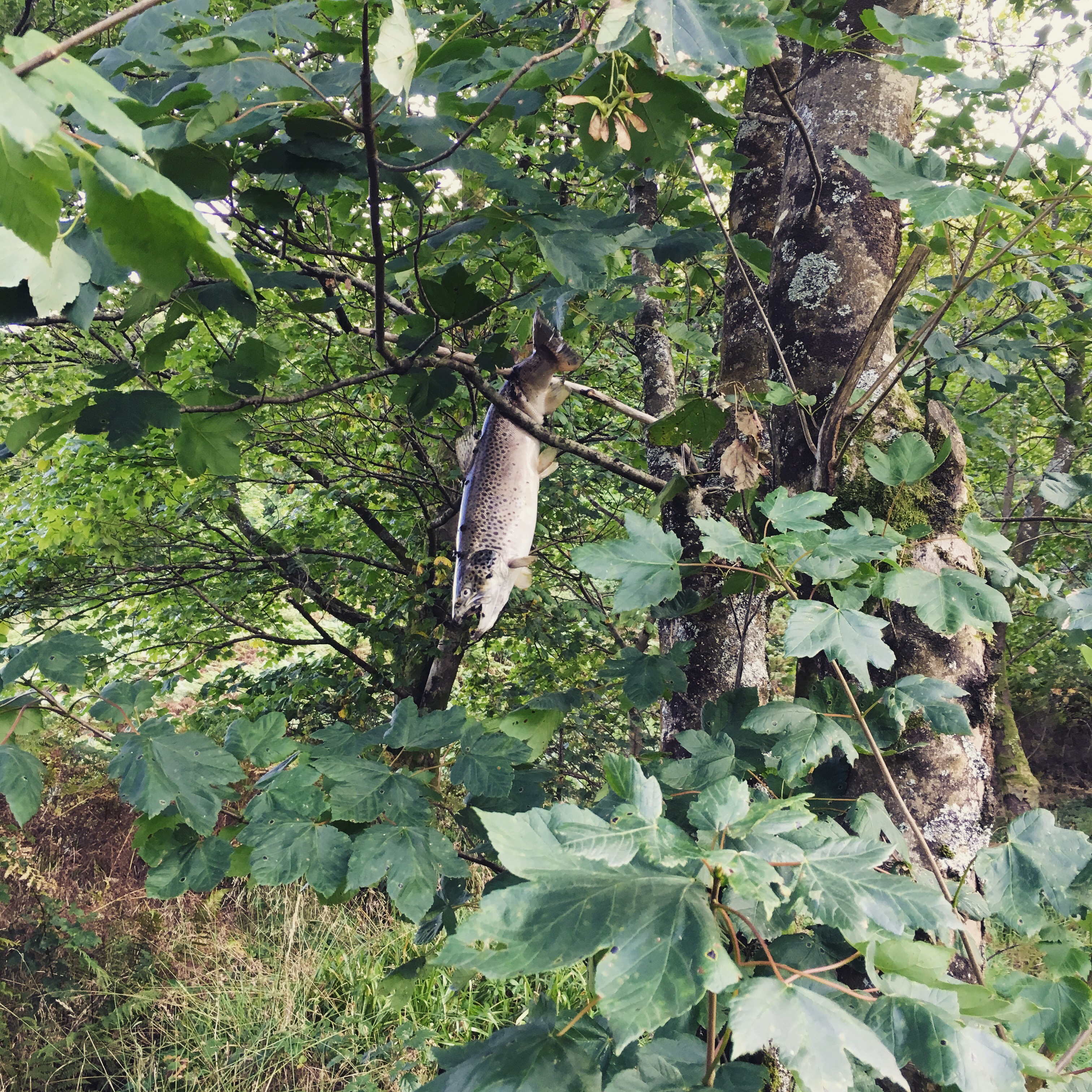 Das Wasser des Sees ist eisig kalt und gleichzeitig recht flach, so dass aus der geplanten Schwimmung eher eine kurze Planschung wird. Bei einem Erkundungsgang in ein nahegelegenes Gebüsch entdeckt der Hase einen im Baum hängenden frischen Lachs, der dort wahrscheinlich geparkt wurde, während seine Bezwinger wandern sind. Das weckt natürlich seinen Angelehrgeiz und so werden Bruder und Baldschwägerin auch einmal Zeugin eines Angelversuchs. Wir können zwar jede Menge kleine Fische sehen, die kurz unter und auch über der Wasseroberfläche herumtollen, aber an die Angel gehen weder sie noch irgendwelche Lachse.