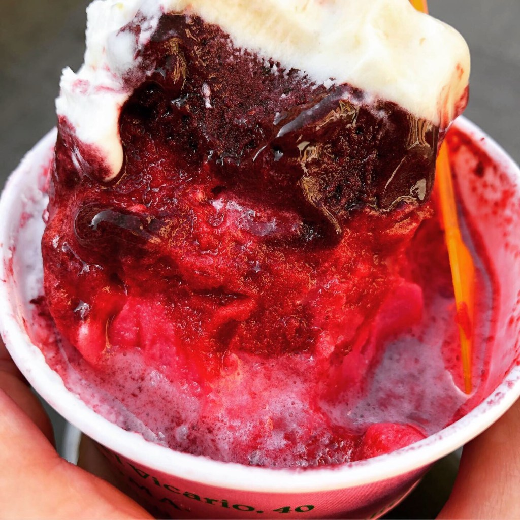 Jetzt liegen also ein paar freie Stunden in Roms Zentrum vor mir, außerdem ist es langsam Zeit etwas zu essen. Logischerweise mache ich mich also zunächst auf zu Giolitti, in die beste Eisdiele der Stadt. Ein schönes Gefühl, an den Menschenmengen vorbeizulaufen, die in Scharen zur Fontana di Trevi oder zur Piazza Navona laufen. Been there, done that, thanks. Bei Giolitti bin ich auch zum dritten Mal, aber dieses Vergnügen ist ja dank der vielen Sorten jedes Mal ein anderes. Ich habe Glück und nur wenige Menschen vor mir in der Schlange. Für meine coppa grande wähle ich die vier Sorten Granatapel, Brombeere, Wildkirsche und Birne-Walnuss-Karamell, dazu gibt es natürlich noch eine Portion Sahne. Das muss bei Giolitti sein, denn erstens ist sie im Preis inbegriffen und zweitens schmeckt sie leicht angefroren vom Eis wirklich vorzüglich. Der Eismensch fragt mich übrigens auf Englisch nach meinen Wünschen, ich antworte auf Italienisch und bekomme das Eis dann mit deutschen Worten überreicht. Einen Akzent habe ich also ganz eindeutig, auch wenn mir nicht klar ist, an welchen Lauten er festzumachen ist, habe ich doch mein Italienisch hauptsächlich aus kampanischen Mündern, also quasi mit süditalienischem Dialekt gelernt.