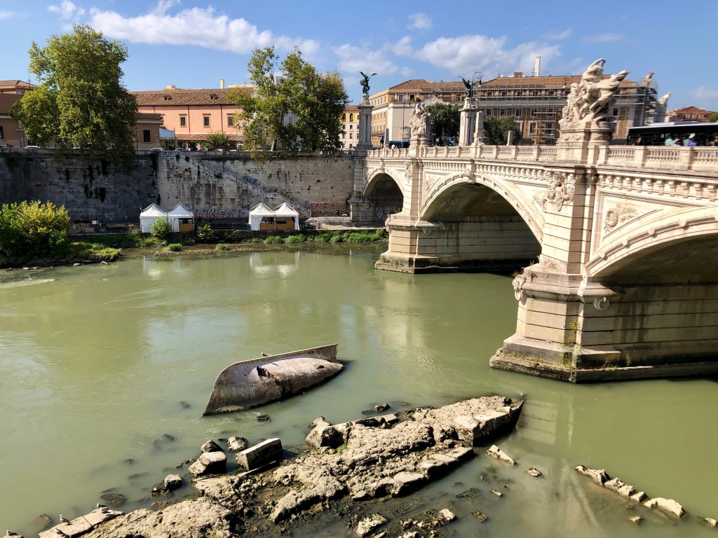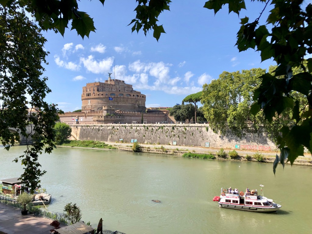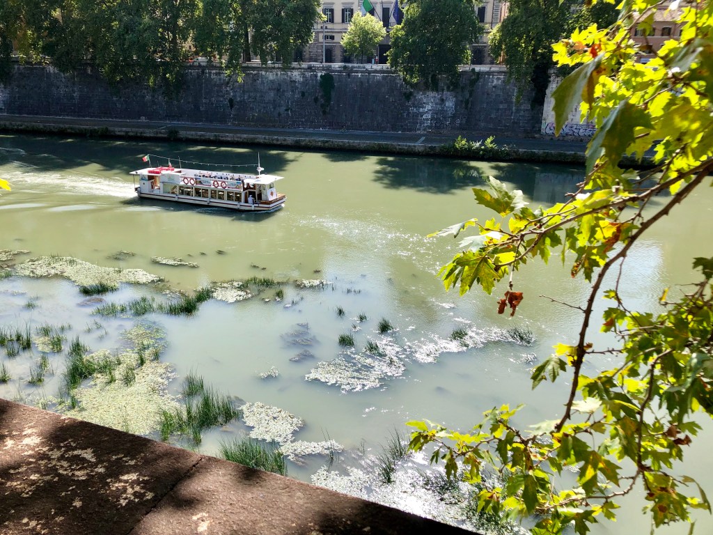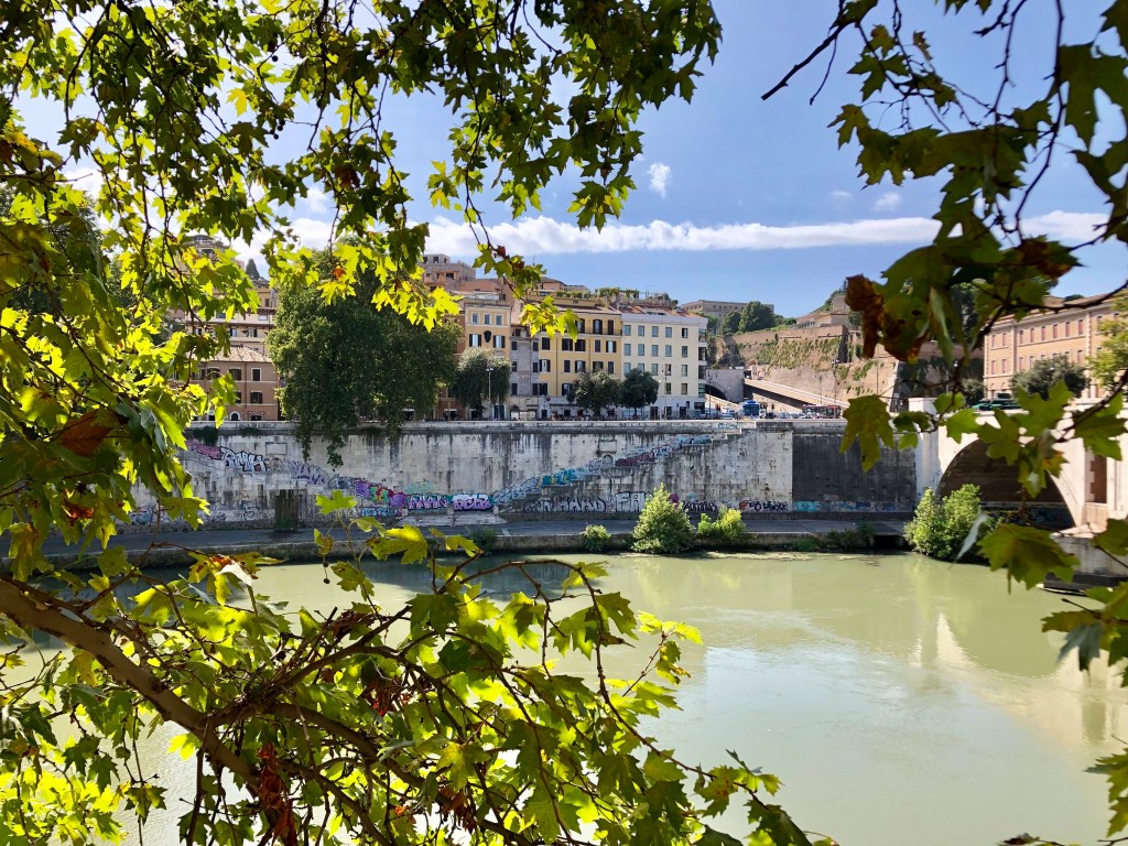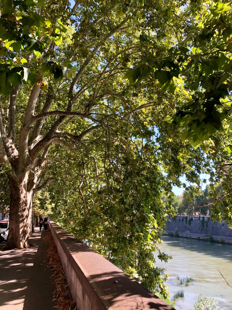 Als ich die Eisdiele verlasse stehen draußen schon wieder Menschenmassen in der Schlange, mein Timing war also wirklich perfekt. Ich suche mir eine ruhige Ecke zum Hinsetzen und löffle genüsslich mein Eis. Hier muss ich die Zero-Waste-Sache leider mal aufgeben, denn vier Kugeln schmelzen schnell und ich esse Eis eher langsam, eine Waffel wäre also sicherlich durchgeweicht und außerdem mit der Sahne dazu dann doch etwas viel gewesen. Nach dem Aufessen sehe ich auf Google Maps, dass ich mich schon fast am Tiber-Ufer befinde und spaziere also dort hin und dann im Schatten der Platanen am Fluss entlang – beginnend an der Engelsburg und endend am Ponte Sisto.