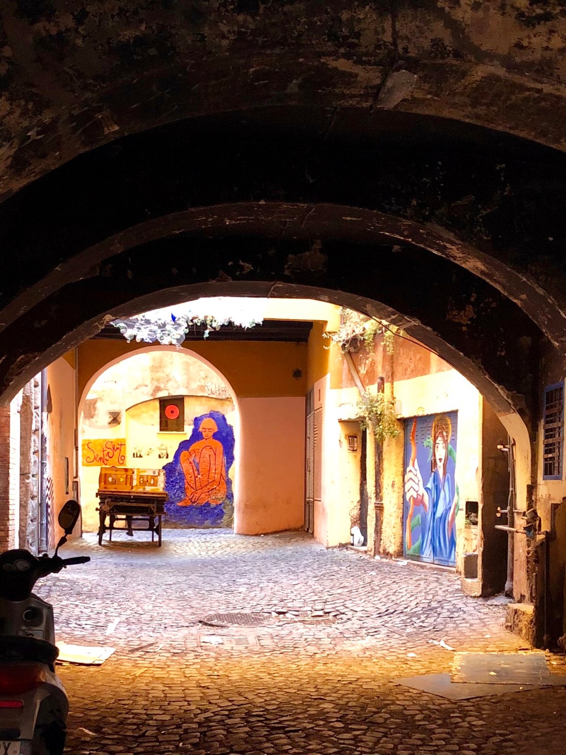 In Ostiense steige ich aus und laufe vorbei an der Pyramide, die den Eingang zu Testaccio markiert, zu dem alten Palazzo, in dem mein Host lebt. Er empfängt mich an der Straße, dann steigen wir erst eine Treppe hinauf, um in den sehr grünen Innenhof zu gelangen, von dem die verschiedenen Aufgänge zu den Wohnungen führen. Sie sind alphabetisch benannt und wir müssen zum Aufgang O. Oben erwartet mich ein kleines Studio-Apartment mit Wohnküche, Bad und Schlafzimmer. Mein Host selbst wird das Wochenende über nicht da sein, so dass ich die komplette Wohnung für mich haben werde. Aber erst putzt er noch schnell das Bad fertig und gibt mir Tipps, wo ich in der Nähe gut und authentisch römisch essen gehen kann.