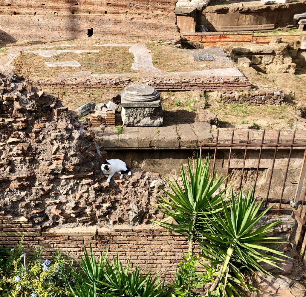 Von dort geht es durch enge Gassen mit eher alternativen Läden und Streetart zum Campo dei Fiori, wo gerade der Markt abgebaut wird. Ich nicke Giordano Bruno einen Gruß zu – pflichtbewusst, denn nichts anderes hätte Il Professore von mir verlangt, wäre er dabei – und spaziere weiter zum Largo di Torre Argentina, wo in einer archäologischen Ausgrabungsstätte viele, viele Katzen leben. Auch sie wollen jedes Mal besucht werden, wenn ich in Rom bin. Inzwischen gibt es dort auch einen Verein, der die Katzen füttert, impft und sterilisiert. Man kann gegen Spenden Souvenirs erwerben, eine Katze aus der Ferne adoptieren oder einfach so Spenden da lassen.