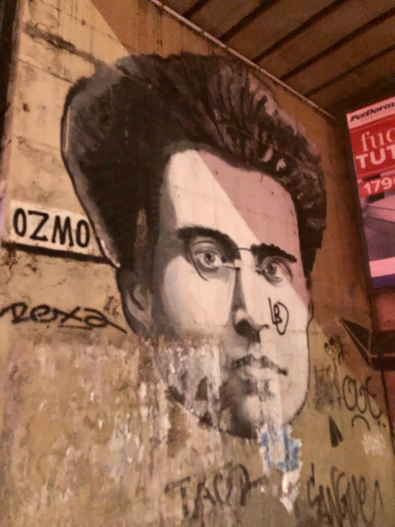 Ich ruhe mich ein wenig aus und mache mich frisch, dann laufe ich gegen 20 Uhr hinaus ins römische Nachtleben. Ich freue mich über die hiesige Streetart mit einem Portrait von Antonio Gramsci – eine weitere Erinnerung an Il Professore. Dann erreiche ich die von meinem Host empfohlene Pizzeria, die „günstig, aber sehr gut“ ist und außer Pizza auch Bruschetta, Fritti, Pasta (4 traditionelle römische Sorten und Gnocchi, aber die nur donnerstags), Fleisch, Fisch und Desserts serviert. Sie ist sehr groß, laut und hektisch, aber so stelle ich mir das in Rom auch vor. Ich bekomme einen Tisch gleich am Eingang und in der Nähe des Pizzaofens und kann den Pizzaioli bei der Arbeit zusehen. Beim Bestellen erinnere ich mich wieder an alles, was ich je bei Rachel gelesen habe und entscheide mich für Supplì, Fiore di Zucca, Cacio e pepe und weil das alles ziemlich teig- und fettlastig ist noch eine Insalata Mista. Sie kommt als eine große Schüssel voll verschiedener Blattsalate und Tomatenstücke auf den Tisch, dazu gibt es Olivenöl, Balsamico und Salz. Achja und ein Viertel vom roten Hauswein habe ich natürlich auch bestellt – der erste Rotwein auf dieser Reise.