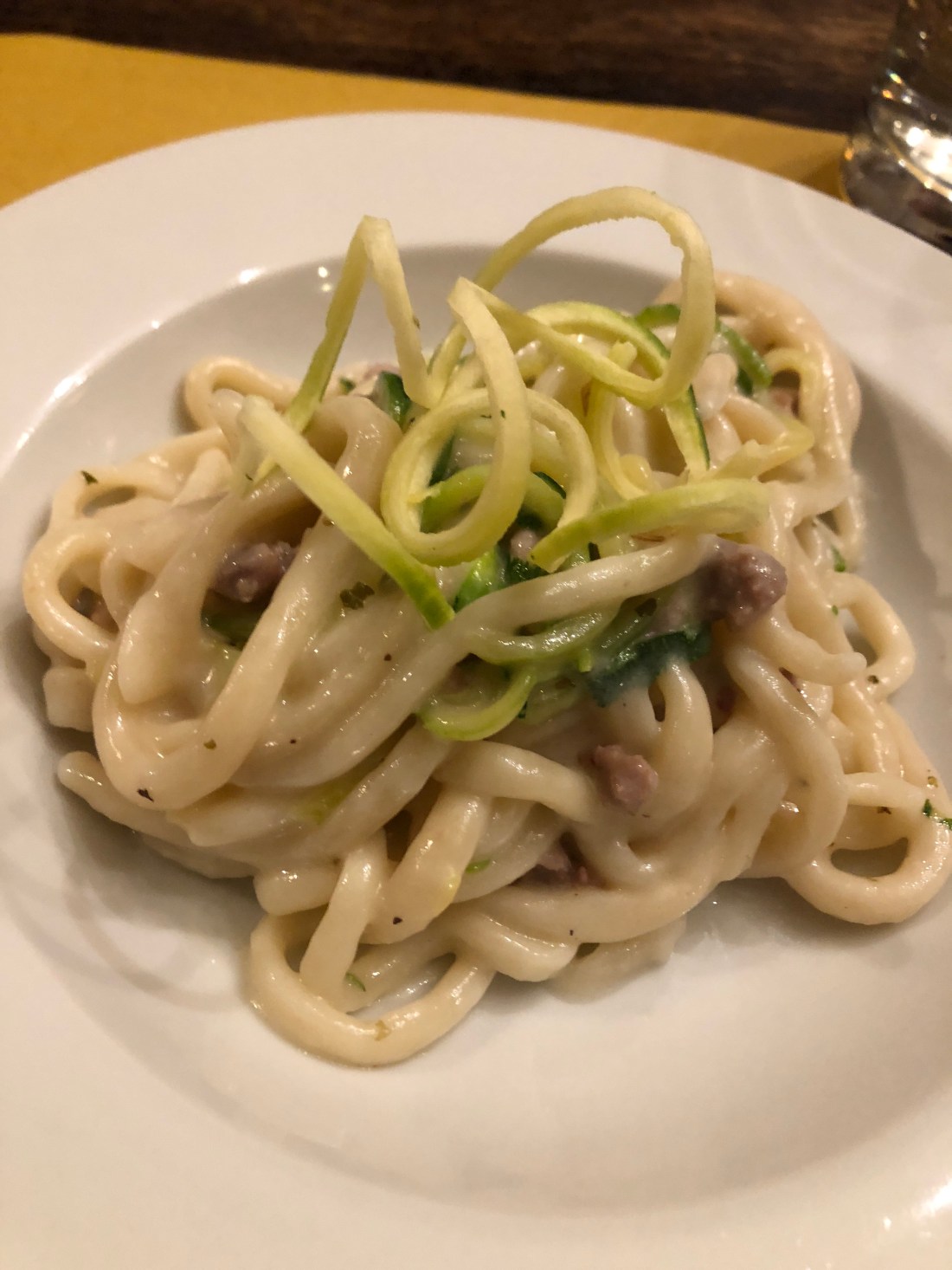 Nebenan gibt es ein Geschäft für mediterrane Delikatessen, das da schon ewig ist, aber in dem ich noch nie war (in dem Bioladen hingegen zumindest alle paar Monate mal). Diesmal ging ich spontan rein, um mich „nur mal umzusehen“. Zum Glück hatte ich schon einen schweren Beutel dabei, sonst hätte ich wahrscheinlich viel zu viel eingekauft. Mitnehmen musste ich aber den Leone und den Lamùri, meine beiden sizilianischen Lieblingsweine vom Weingut der Familie meiner lieben Freundin Fabrizia. Diese Weine findet man in Berlin relativ selten im Laden, selbst der italienische Supermarkt, in dem ich regelmäßiger einkaufe, führt sie nicht. Also griff ich schnell jeweils zu einer Flasche und verließ dann den Laden umgehend, aus Angst, noch mehr Geld auszugeben. Ich werde aber demnächst mit dem Hasen wiederkommen und dann auch mal die Frischfischtheke genauer in Augenschein nehmen.