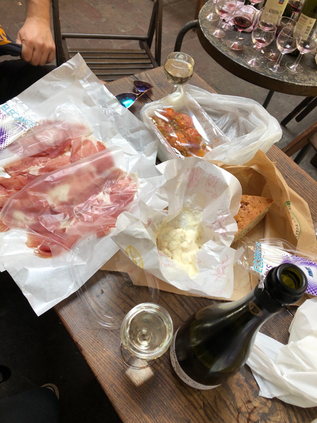 Dann duschen wir, ziehen uns an und brechen mit unserer Gastgeberin auf in die Stadt. Unterwegs fühle ich mich, als wäre ich mit Lorelai Gilmore in Stars Hollow unterwegs. Es ist ein einziger „Walk & Talk“, sie erzählt uns alles über alles und jeden und ständig halten wir irgendwo an, weil sie Bekannte getroffen hat oder in ihren Stammläden ihre Freunde begrüßen möchte. In einer kleinen Gasse angekommen, kauft sie in einem Laden Brot, in einem anderen Parmaschinken und Gorgonzola und in einem dritten Polpette in Tomatensauce mit Erbsen. Das alles nehmen wir dann mit in einen vierten Laden, der sich als die Osteria del Sole entpuppt, die bereits seit 1465 existiert.