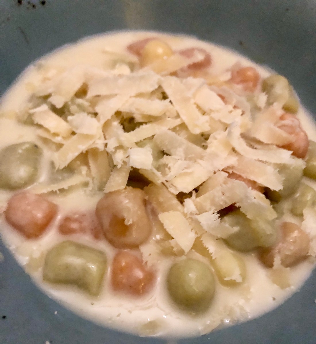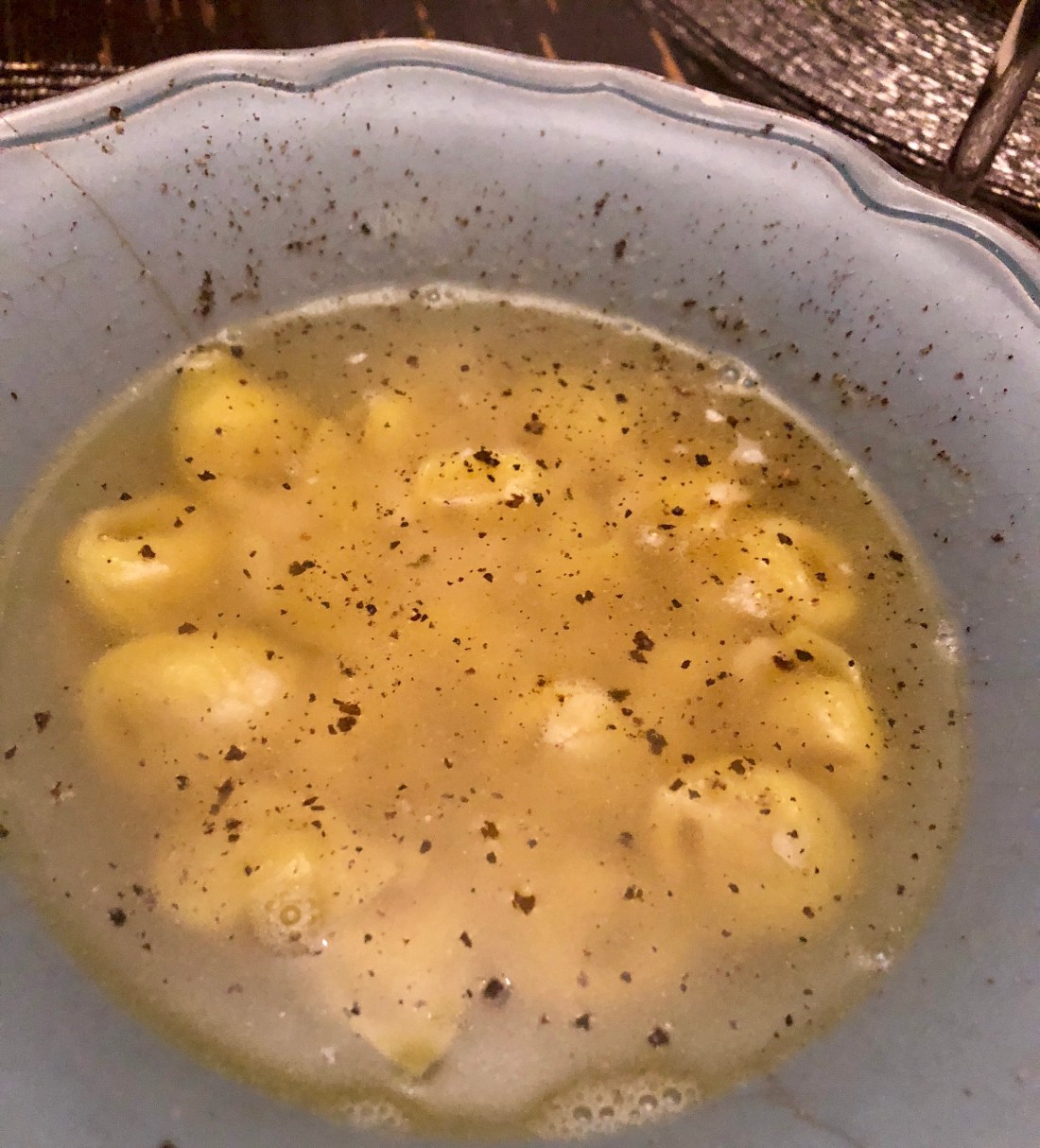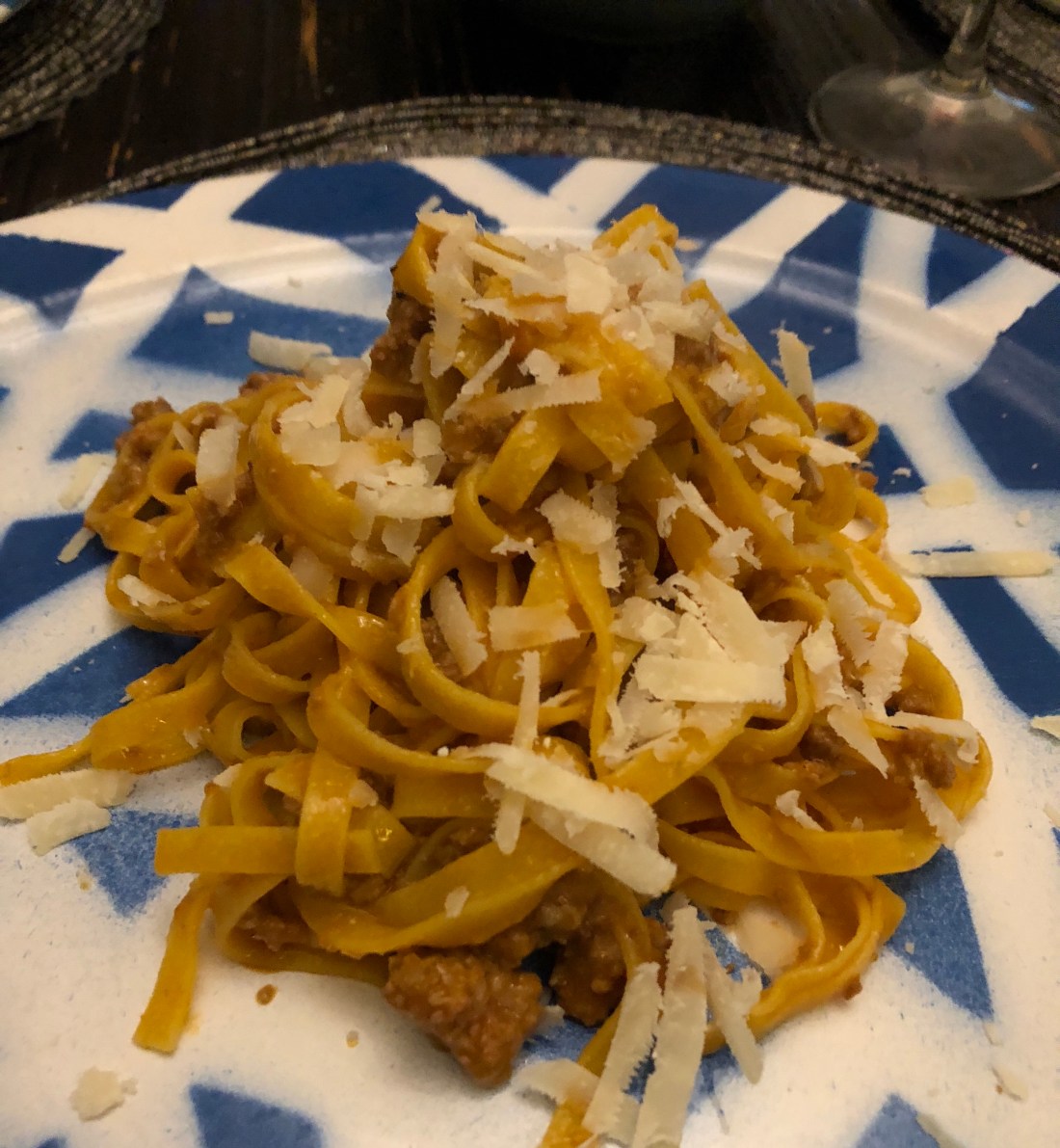 Der Soundtrack für den Abend ist also schonmal sehr gut, das Essen wird es erst recht werden. Unsere Gastgeberin verdient ihr Geld damit, für Leute zu kochen und heute bekommen wir einige der typischen Spezialitäten aus Bologna vorgesetzt. Es beginnt mit handgemachten Tortellini in Brühe, darauf folgen Gnocchi mit vier verschiedenen Käsesorten. Dazu gehört ein Sangiovese aus der Region. Dann folgen die Tagliatelle al ragù, die mit „Spaghetti Bolognese“ wirklich gar nichts zu tun haben mit einem sehr leckeren Pinot Grigio. Zum Nachtisch serviert sie uns frische Ananas mit Sojasahne und Schokokekskrümeln.