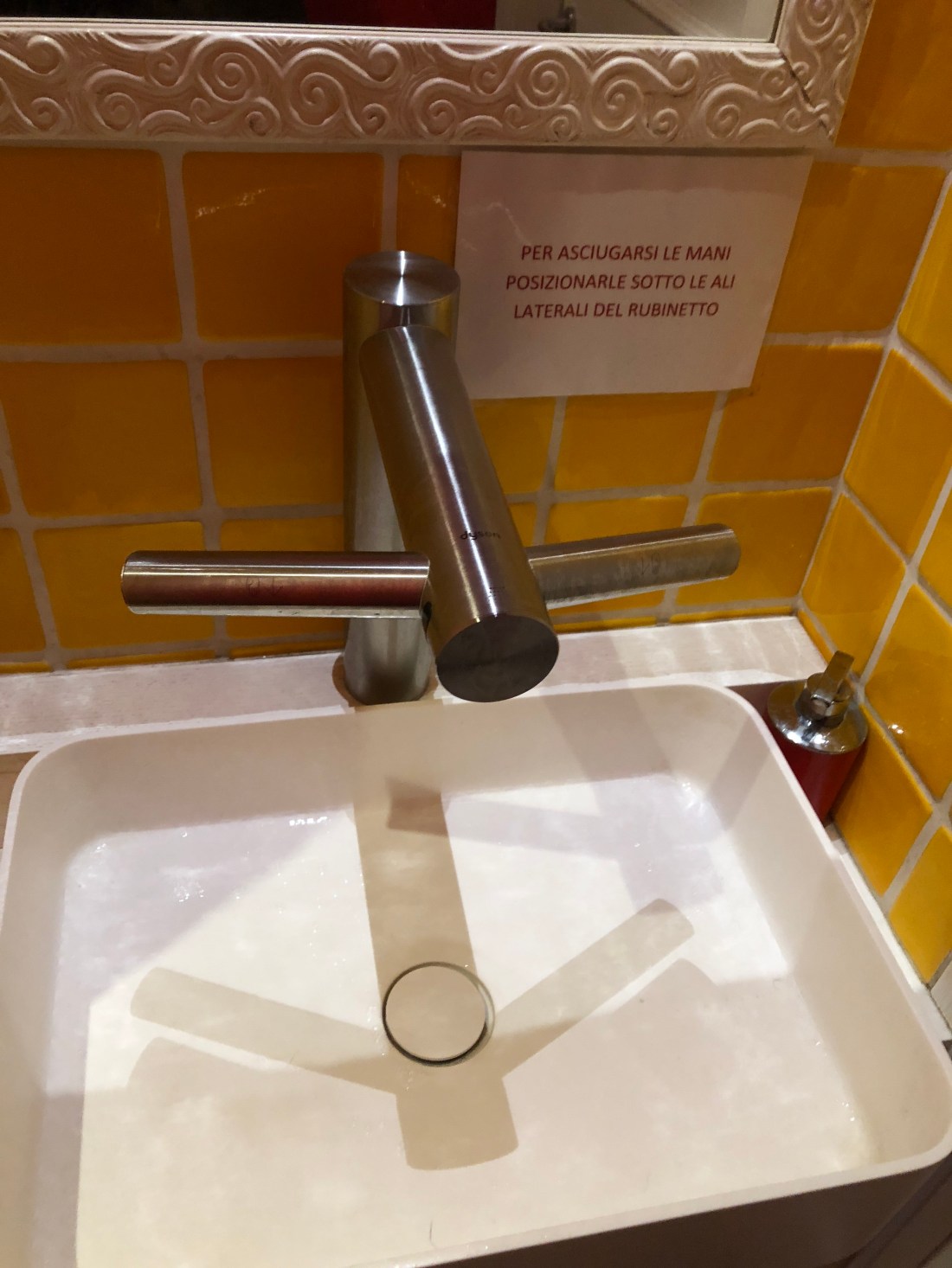 Ziemlich hip war dafür dann das Waschbecken, zum Glück konnte ich gut genug Italienisch, um zu verstehen, wie ich meine Hände trocken bekomme. Das Gerät ist übrigens von Dyson, was auch Nicht-Italophonen eine Vorstellung geben dürfte.