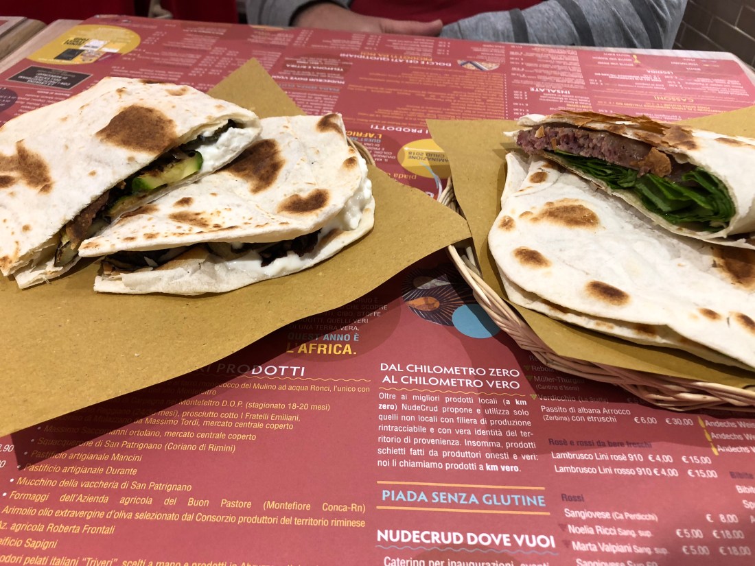 Von Gradara ging es weiter nach Rimini. In Viserba, quasi dem Warnemünde von Rimini, bezogen wir unser AirBnB-Zimmer, das sich als Hotelzimmer entpuppte, direkt am Strand und mit Blick auf die Adria. Dann fuhren wir in die Stadt hinein und bummelten über Augustus-Bogen, Corso und Tiberius-Brücke in den Stadtteil Borgo San Giuliano, der einst das Fischerviertel und heutzutage gentrifiziertes Kneipenviertel ist. Hier aßen wir Piadine, denn schließlich waren wir wieder in der Emilia-Romagna angekommen. Die eine war mit Salsiccia und Radicchio, die andere mit Squaquerone und gegrilltem Gemüse. Danach ging es für uns früh ins Bett. Eigentlich hätten wir ja noch einen Fellini-Film oder zumindest eine Doku über den größten Sohn der Stadt gucken müssen, aber dank Schnecken-WLAN blieb es dann doch beim Lesen und frühen Schlafen.