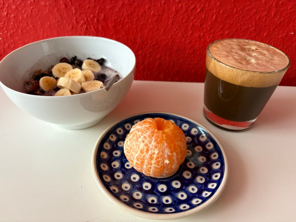 Heute weckt mich der Wecker, keine Katze. Auch mal schön. Der Wecker klingelt, weil ich am Vormittag einen Termin habe und trotzdem meinen morgendlichen Reboot in aller Ruhe und ohne Stress absolvieren möchte und das klappt auch sehr schön. Irgendwann ist dann Zeit fürs Frühstück und das besteht heute aus Blaubeer-Cassis-Müsli, Hafermilch, der letzten kanarischen Banane, einer Mandarine und einem Espresso Tonic (aufgrund der winterlichen Stimmung ohne Eis).