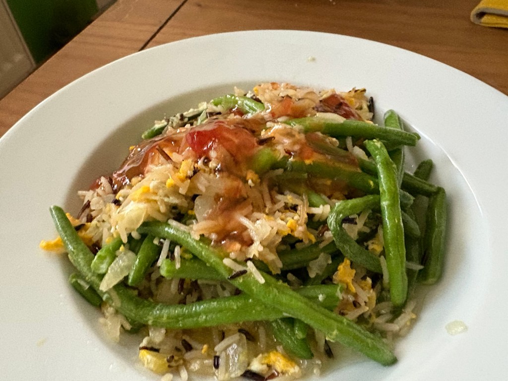 Bis zum Mittagessenhunger vergeht noch etwas Zeit, aber als es soweit ist, gibt es den Rest Reis von gestern mit Zwiebeln, TK-Bohnen, Ei und Chilisauce.