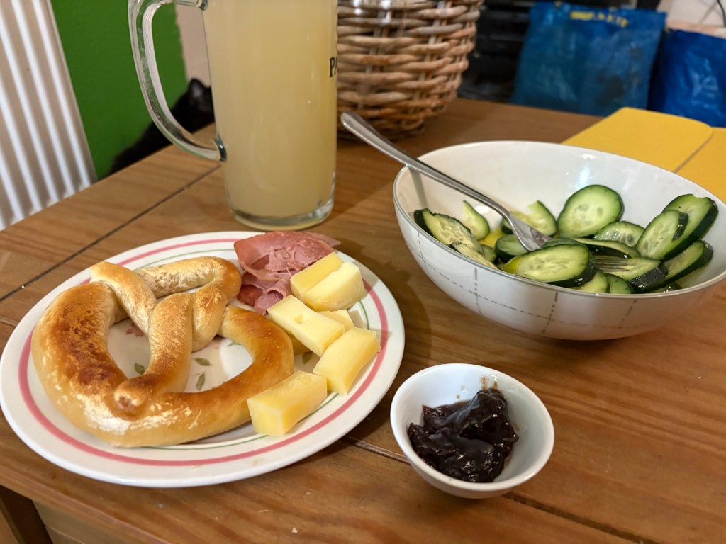 Zwischendrin gibt’s irgendwann auch noch Abendbrot, nämlich die wirklich allerletzte Gurke als Salat, eine TK-Breze, veganen Kochschinken und Käsewürfel mit Pfirsich-Chutney, dazu letzten Apfelsaft als Schorle. Gaumen und Magen fühlen sich sehr privilegiert und gehen mit dem Rest von mir gegen Mitternacht zufrieden schlafen.