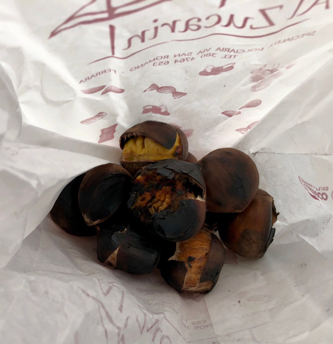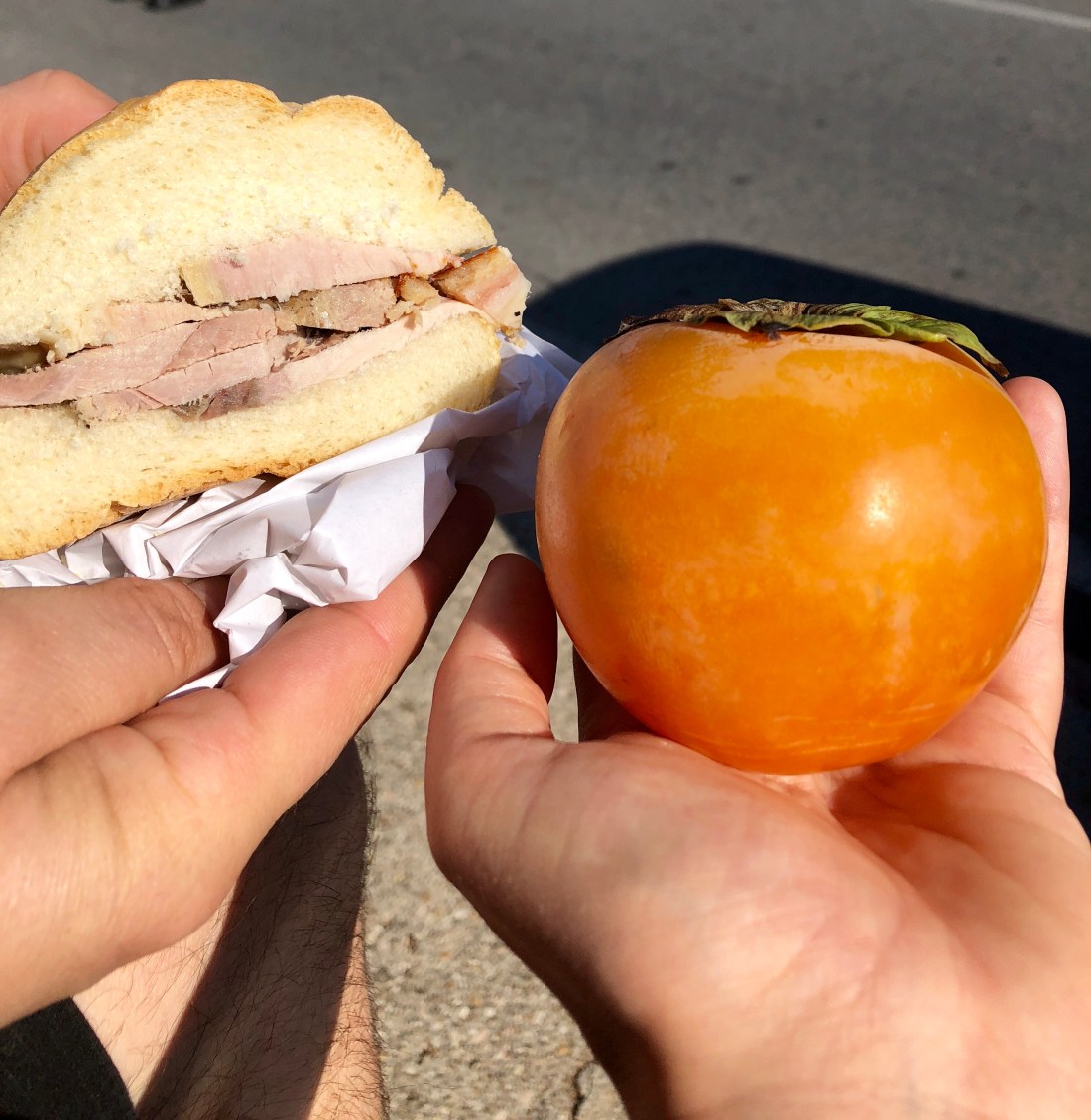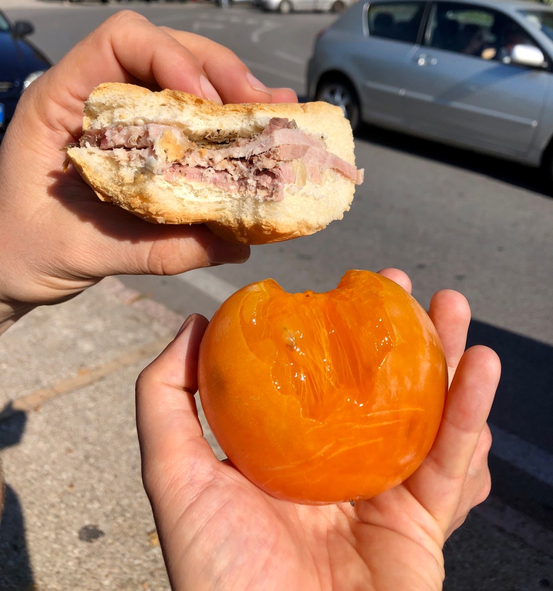 Wir hingegen fuhren weiter nach Assisi, wo wir zunächst den Wochenmarkt besuchten und uns mit Pecorino, Trüffelkäse und zwei Sorten Salami für Zuhause eindeckten. Dann stärkten wir uns jeder nach seinem Geschmack – der Hase mit einer deftigen Porchetta-Semmel, ich mit einer sonnengereiften Kaki. Hier mal das Vorher-Nachher-Bild, damit Ihr einen Eindruck bekommt, wie sowas eigentlich auszusehen hat – nördlich der Alpen bekommt man ja selten reife Kakis zu sehen und essen.