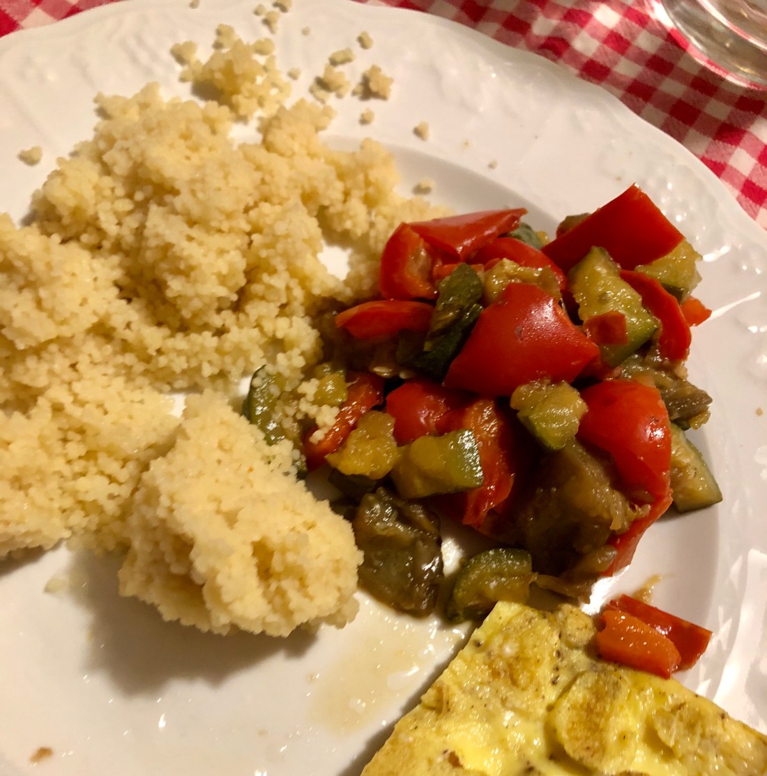 Schließlich fuhren wir alle gemeinsam weiter zur Familie der italienischen Cousine, die in einem Vorort von Ancona lebt. Dort gab es dann typisch italienische Gastfreundschaft und ein tolles Abendessen mit Antipasti (eingelegte Artischocken, Caprese, diverse Käsesorten und Taralli), Couscous, geschmortem Gemüse, Omelette, Obst, Gebäck mit Gianduia-Creme und leckeren Likören. Zum Essen gab es erst den Rotwein, den wir mitgebracht hatten (den eigentlich geplanten Rotwein, Lacrima di Morro d’Alba, bekamen wir dann gemeinsam mit den Resten der Käsesorten, die dem Hasen so geschmeckt haben, als Geschenk übergeben) und dann einen Verdicchio Castelli di Jesi, beides Weine direkt aus der Gegend.