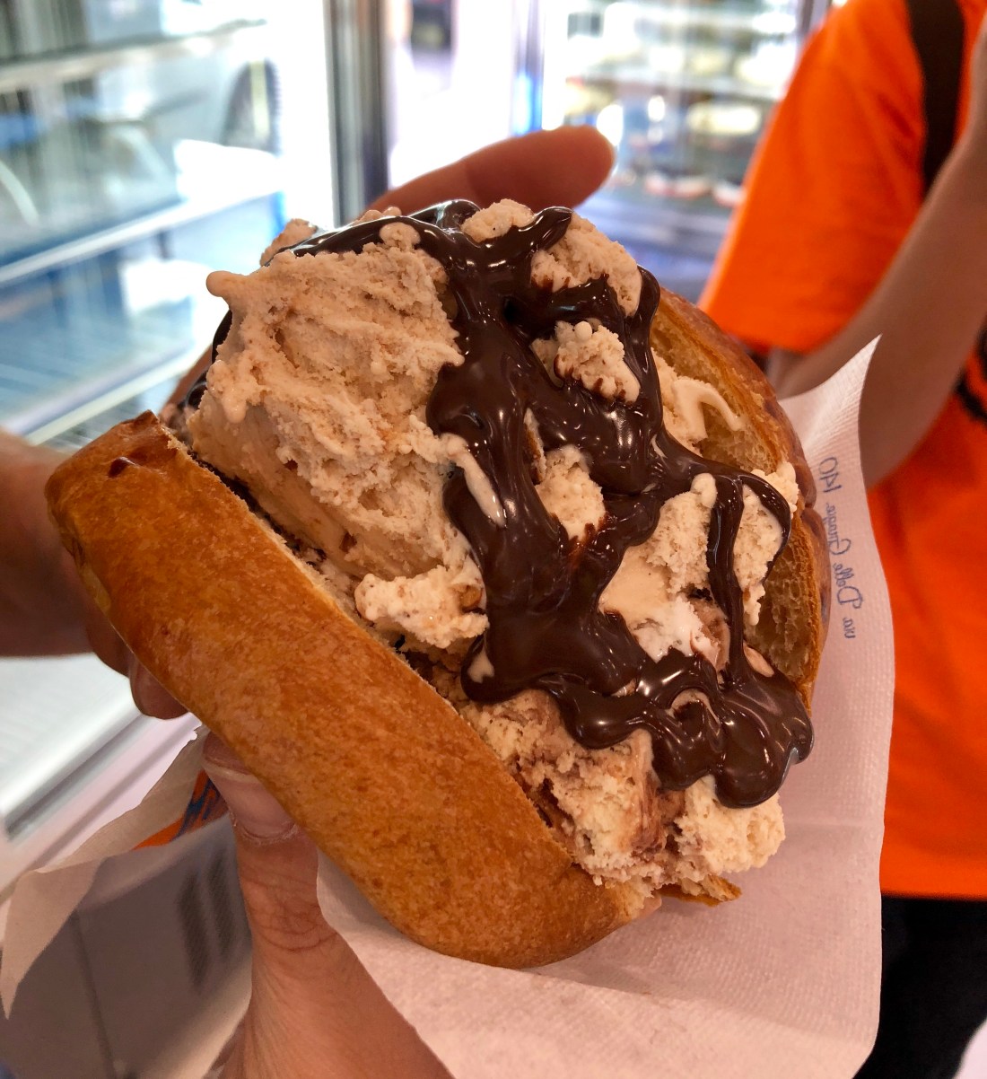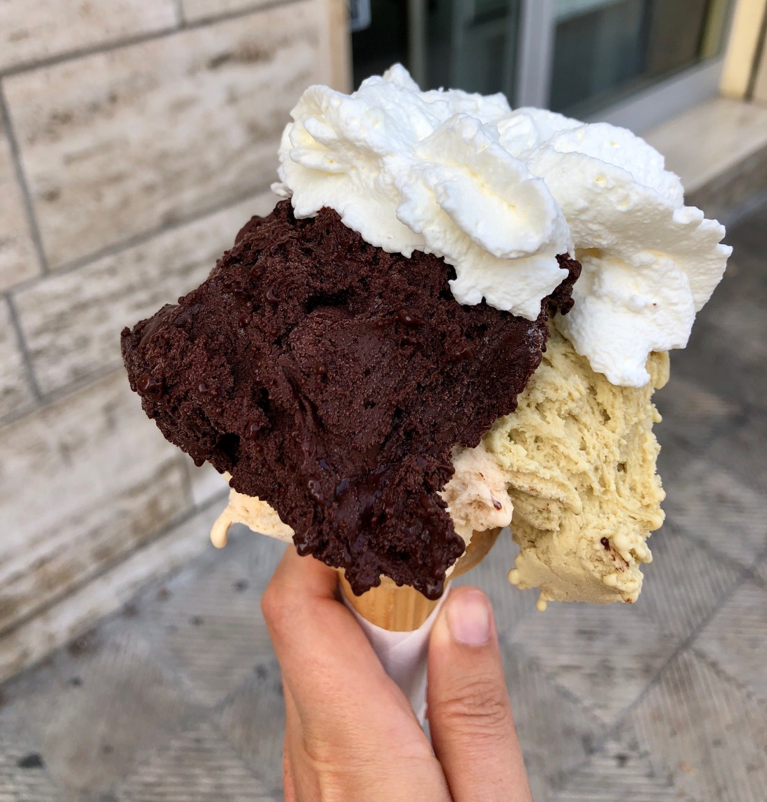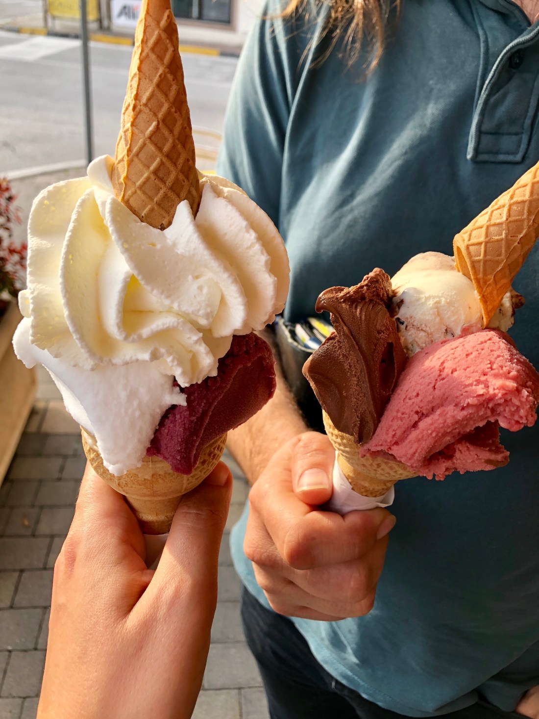 Also guckten wir nur aufs bzw. warfen Steine ins Wasser und erzählten. Dann fuhren wir nach Ancona hinein, hielten aber nochmal an einem Stand, an dem die Cousine Paccacassi entdeckt hatte, eine Pflanze, die zwischen den Steinen wächst und dieser Gegend als Delikatesse gilt. Wir nahmen ein kleines Glas eingelegte Paccacassi mit und werden sie zuhause mal probieren – z. B. auf Bruschetta. Als nächstes gingen wir in die Eisdiele, die direkt um die Ecke von der Oma der italienischen Cousine ist. Der Hase aß endlich sein Eis aus einer Brioche und auch wir anderen beiden gönnten uns jeweils drei Kugeln, wenn auch in der Waffel.